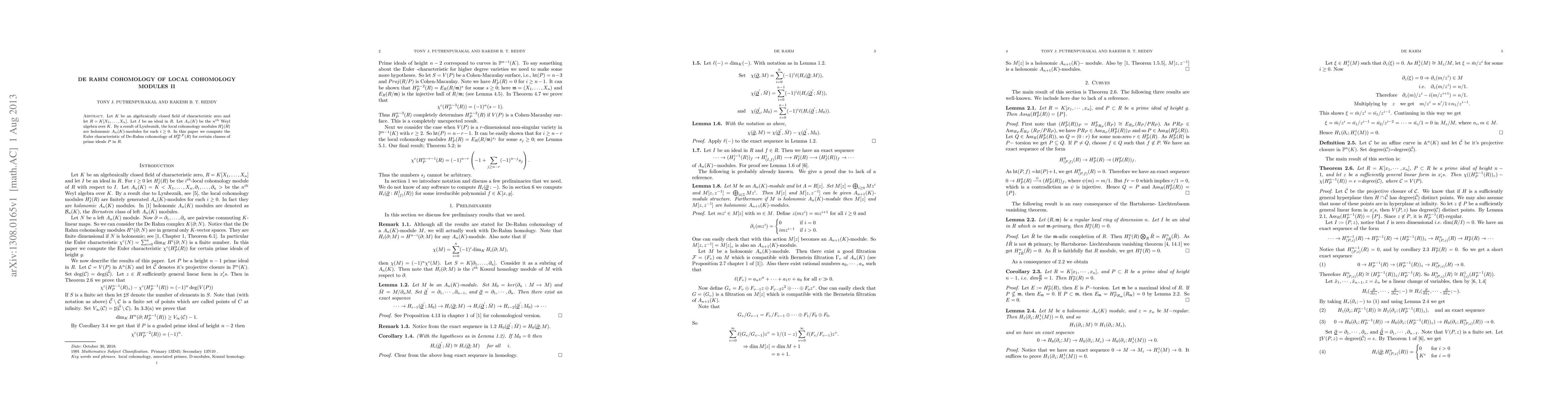 Let $K$ be an algebraically closed field of characteristic zero and let $R = K[X_1,\ldots,X_n]$. Let $I$ be an ideal in $R$. Let $A_n(K)$ be the $n^{th}$ Weyl algebra over $K$. By a result of Lyubeznik, the local cohomology modules $H^i_I(R)$ are holonomic $A_n(K)$-modules for each $i \geq 0$. In this paper we compute the Euler characteristic of De-Rahm cohomology of $H^{\htt P}_P(R)$ for certain classes of prime ideals $P$ in $R$.