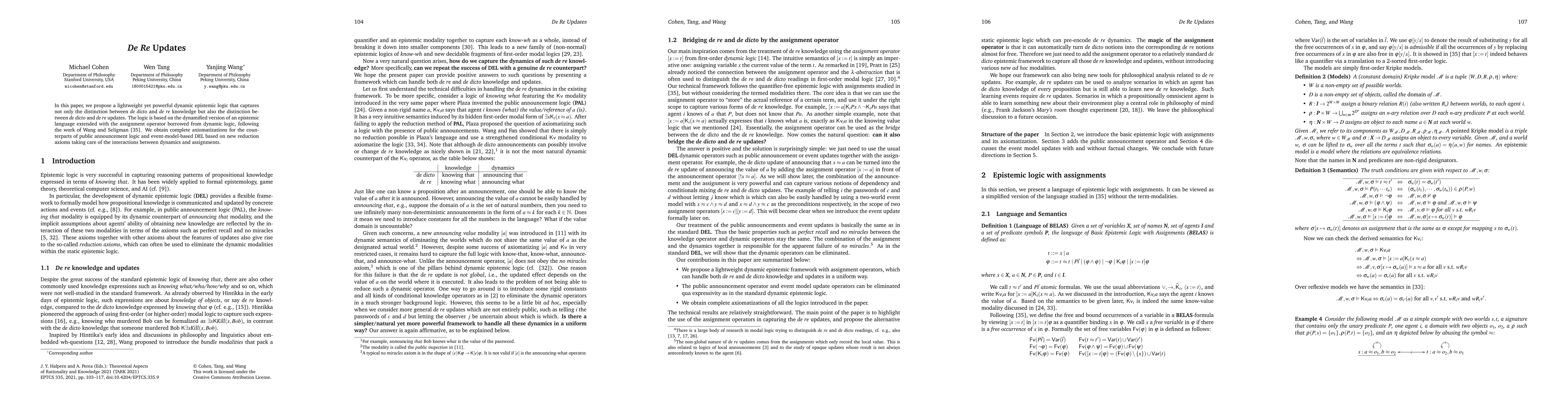 This paper introduces a dynamic epistemic logic that distinguishes between de dicto and de re knowledge and updates. It leverages an extended epistemic language with assignment operators to achieve this, providing complete axiomatizations for public announcement logic and event-model-based DEL.