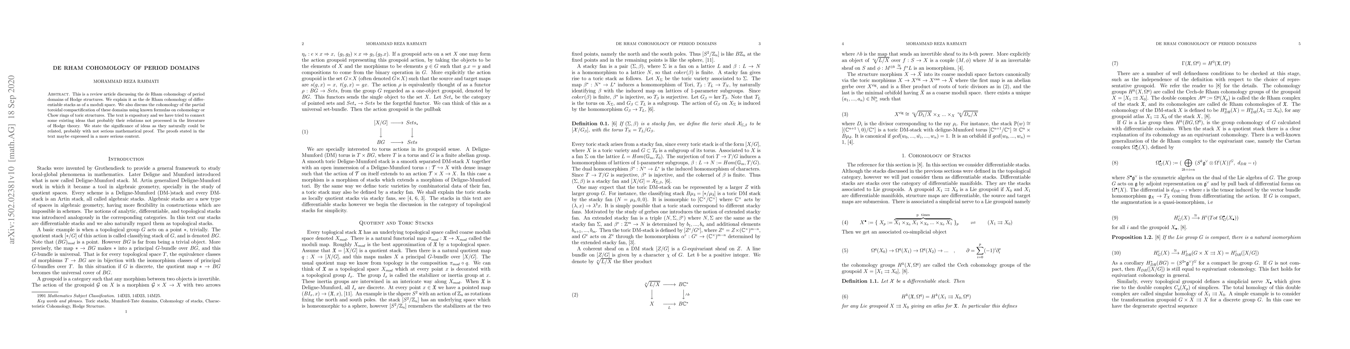 This is a review article discussing the de Rham cohomology of period domains of Hodge structures. We explain it as the de Rham cohomology of differentiable stacks as of a moduli space. We also discuss the cohomology of the partial toroidal compactification of these domains using known formulas on cohomology or Chow rings of toric structures. The text is expository and we have tried to connect some existing ideas that probably their relations not processed in the literature of Hodge theory. We state the significance of ideas as they naturally could be related, probably with not serious mathematical proof. The proofs stated in the text maybe expressed in a more serious context.