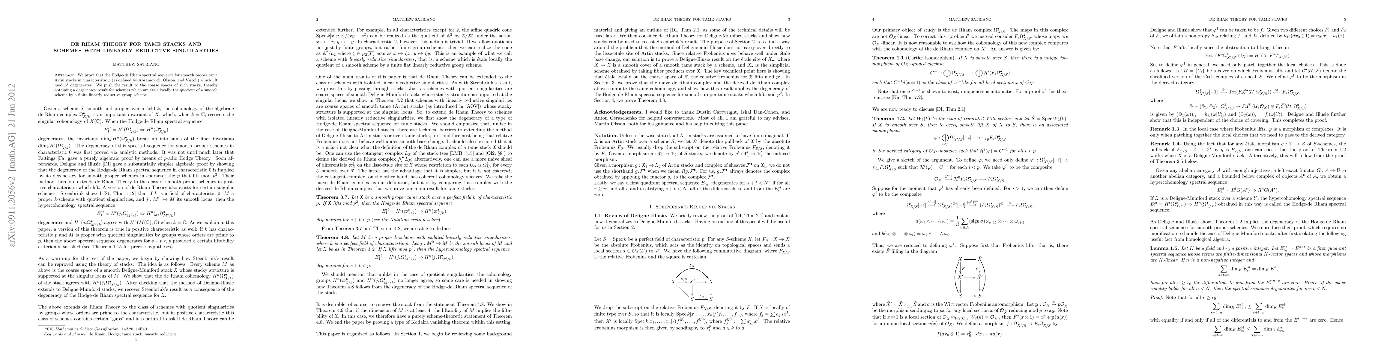 We prove that the Hodge-de Rham spectral sequence for smooth proper tame Artin stacks in characteristic p (as defined by Abramovich, Olsson, and Vistoli) which lift mod p^2 degenerates. We push the result to the coarse spaces of such stacks, thereby obtaining a degeneracy result for schemes which are etale locally the quotient of a smooth scheme by a finite linearly reductive group scheme.