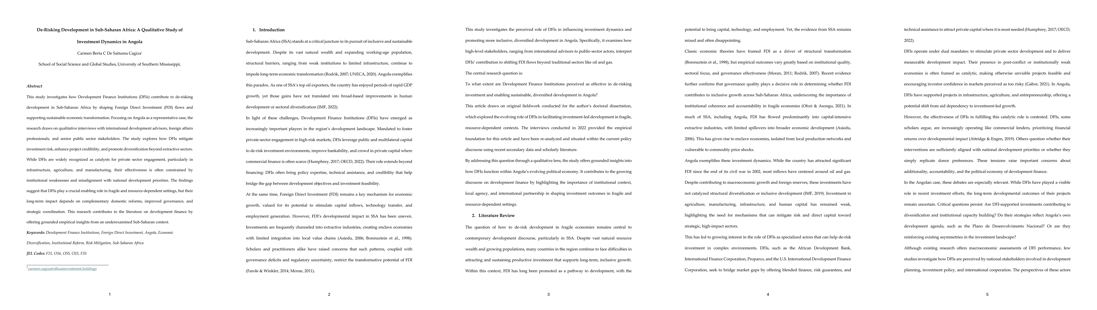 This study investigates how Development Finance Institutions (DFIs) contribute to de-risking development in Sub-Saharan Africa by shaping Foreign Direct Investment (FDI) flows and supporting sustainable economic transformation. Focusing on Angola as a representative case, the research draws on qualitative interviews with international development advisors, foreign affairs professionals, and senior public sector stakeholders. The study explores how DFIs mitigate investment risk, enhance project credibility, and promote diversification beyond extractive sectors. While DFIs are widely recognized as catalysts for private sector engagement, particularly in infrastructure, agriculture, and manufacturing, their effectiveness is often constrained by institutional weaknesses and misalignment with national development priorities. The findings suggest that DFIs play a crucial enabling role in fragile and resource-dependent settings, but their long-term impact depends on complementary domestic reforms, improved governance, and strategic coordination. This research contributes to the literature on development finance by offering grounded empirical insights from an under examined Sub-Saharan context.
