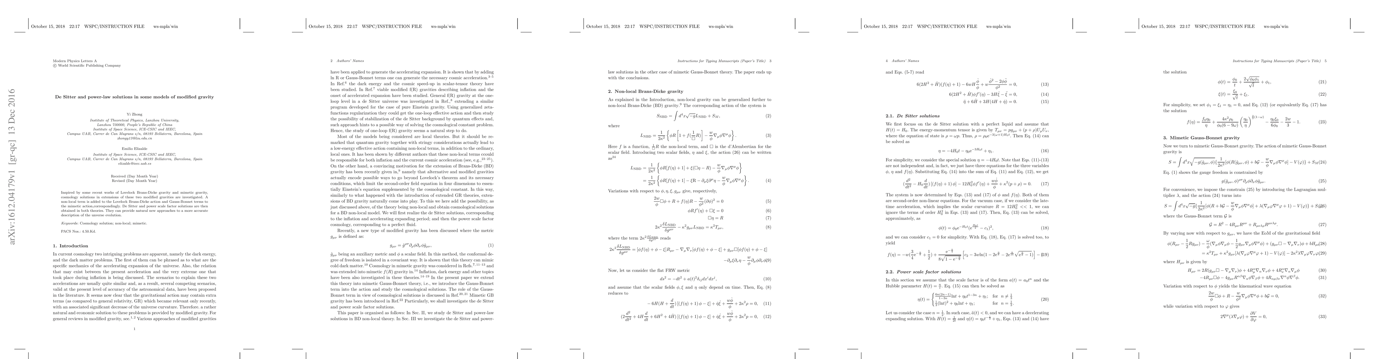 This paper explores cosmological solutions in modified gravity models, adding non-local terms to Lovelock Brans-Dicke gravity and Gauss-Bonnet terms to mimetic gravity. It derives De Sitter and power-law scale factor solutions, offering potential for more precise universe evolution descriptions.