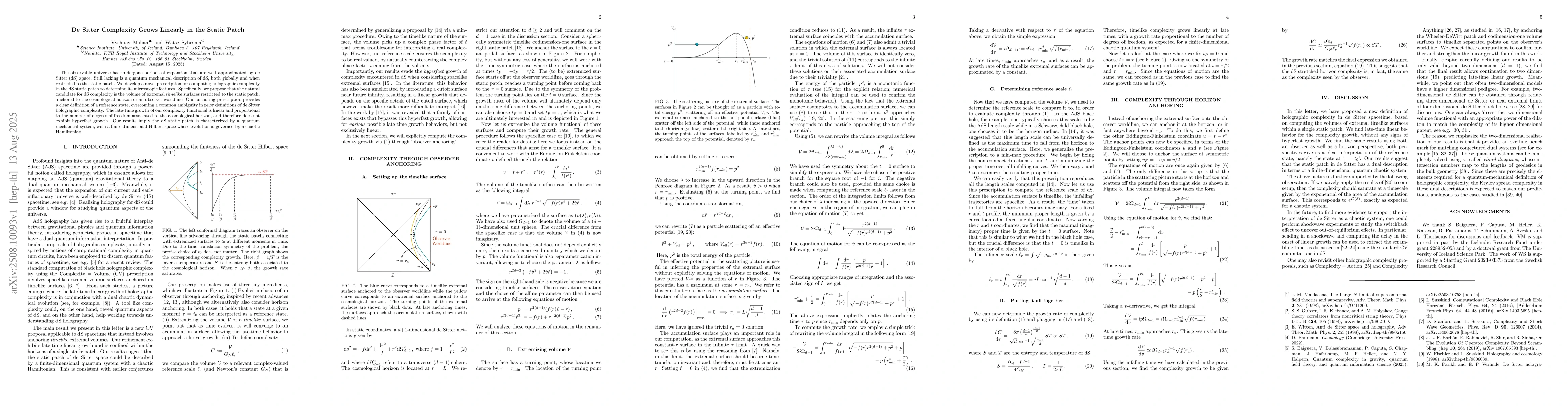 The observable universe has undergone periods of expansion that are well approximated by de Sitter (dS) space. Still lacking is a quantum mechanical description of dS, both globally and when restricted to the static patch. We develop a novel prescription for computing holographic complexity in the dS static patch to determine its microscopic features. Specifically, we propose that the natural candidate for dS complexity is the volume of extremal timelike surfaces restricted to the static patch, anchored to the cosmological horizon or an observer worldline. Our anchoring prescription provides a clear definition of a reference state, overcoming a common ambiguity in prior definitions of de Sitter holographic complexity. The late-time growth of our complexity functional is linear and proportional to the number of degrees of freedom associated to the cosmological horizon, and therefore does not exhibit hyperfast growth. Our results imply the dS static patch is characterized by a quantum mechanical system, with a finite dimensional Hilbert space whose evolution is governed by a chaotic Hamiltonian.