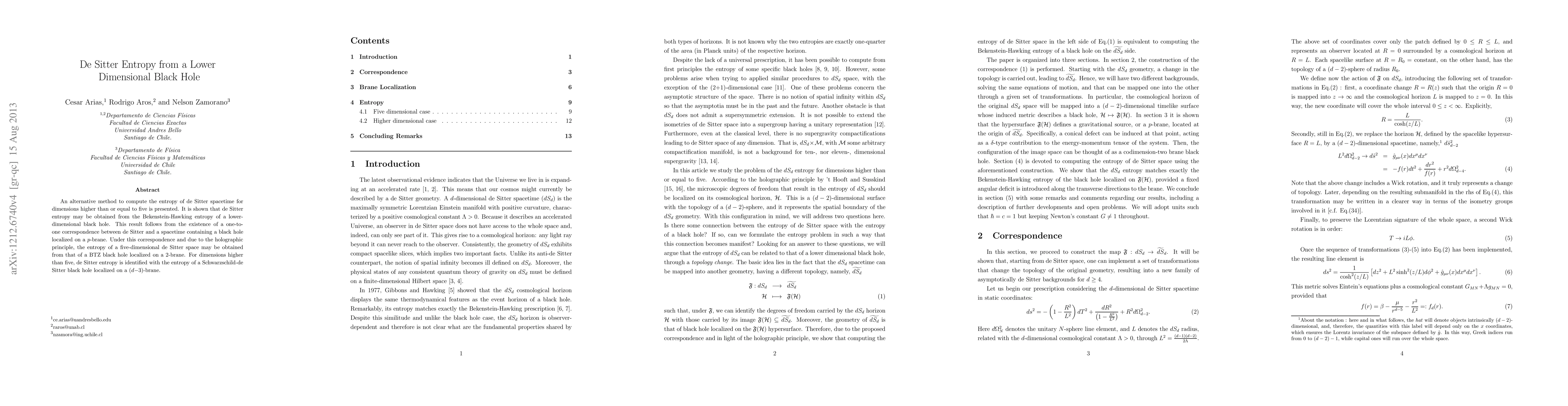 An alternative method to compute the entropy of de Sitter spacetime for dimensions higher than or equal to five is presented. It is shown that de Sitter entropy may be obtained from the Bekenstein-Hawking entropy of a lower-dimensional black hole. This result follows from the existence of a one-to-one correspondence between de Sitter and a spacetime containing a black hole localized on a p-brane. Under this correspondence and due to the holographic principle, the entropy of a five-dimensional de Sitter space may be obtained from that of a BTZ black hole localized on a 2-brane. For dimensions higher than five, de Sitter entropy is identified with the entropy of a Schwarzschild-de Sitter black hole localized on a (d-3)-brane.