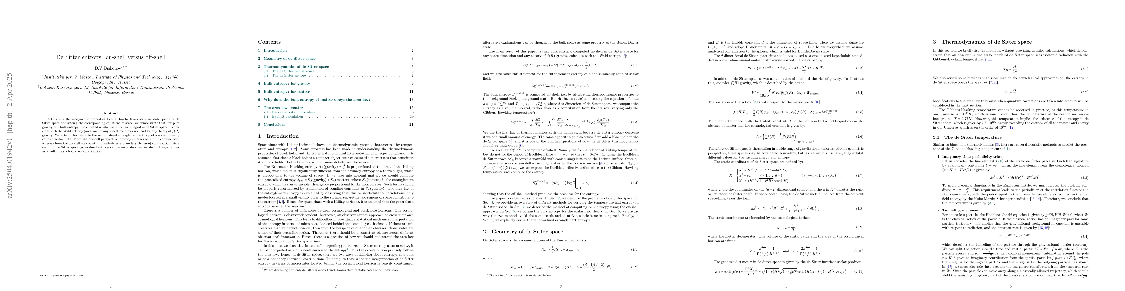 The work extends previous findings on de Sitter entropy by connecting on-shell and off-shell entropy perspectives and generalizing the results to f(R) gravity and non-minimally coupled scalar fields.
