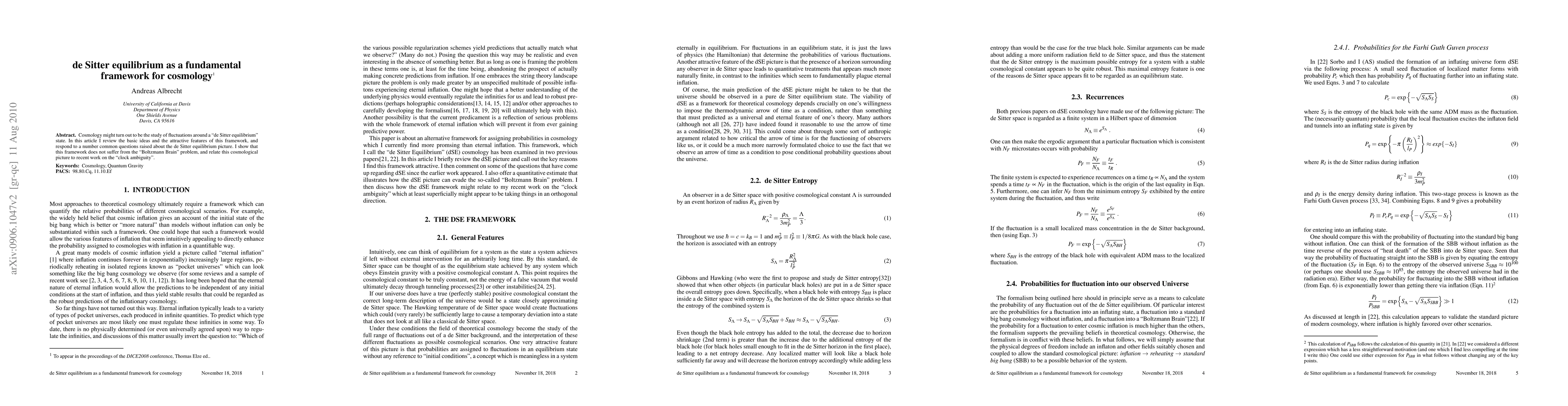Cosmology might turn out to be the study of fluctuations around a "de Sitter equilibrium" state. In this article I review the basic ideas and the attractive features of this framework, and respond to a number common questions raised about the de Sitter equilibrium picture. I show that this framework does not suffer from the "Boltzmann Brain" problem, and relate this cosmological picture to recent work on the "clock ambiguity".