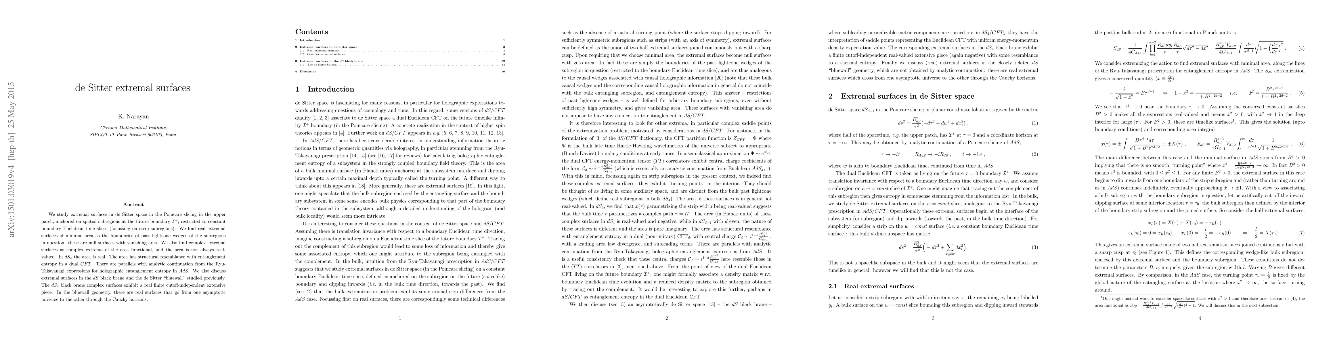 This paper investigates extremal surfaces in de Sitter space, finding minimal real area null surfaces anchored on subregions at the future boundary, and complex surfaces with non-real areas. It draws parallels to entanglement entropy in dual CFT and discusses implications for the de Sitter black brane and "bluewall" geometries.