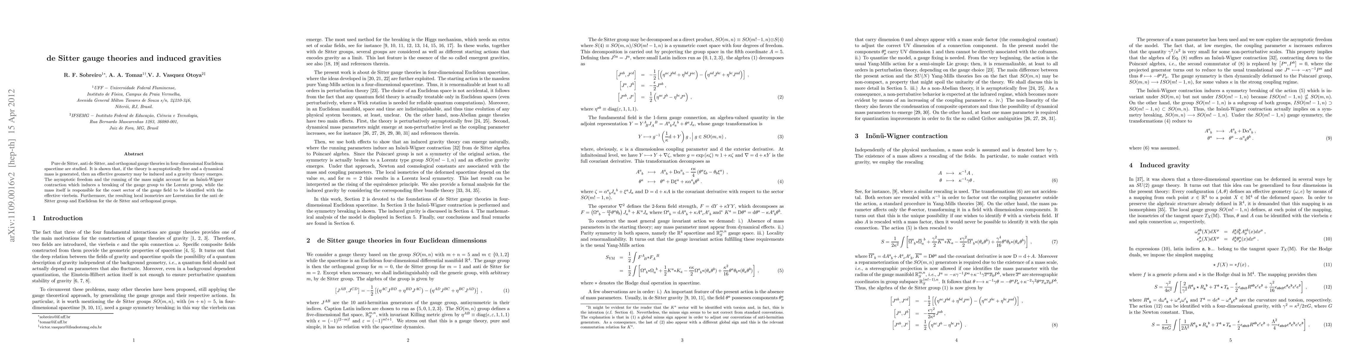 Pure de Sitter, anti de Sitter, and orthogonal gauge theories in four-dimensional Euclidean spacetime are studied. It is shown that, if the theory is asymptotically free and a dynamical mass is generated, then an effective geometry may be induced and a gravity theory emerges. The asymptotic freedom and the running of the mass might account for an In\"on\"u-Wigner contraction which induces a breaking of the gauge group to the Lorentz group, while the mass itself is responsible for the coset sector of the gauge field to be identified with the effective vierbein. Furthermore, the resulting local isometries are Lorentzian for the anti de Sitter group and Euclidean for the de Sitter and orthogonal groups.