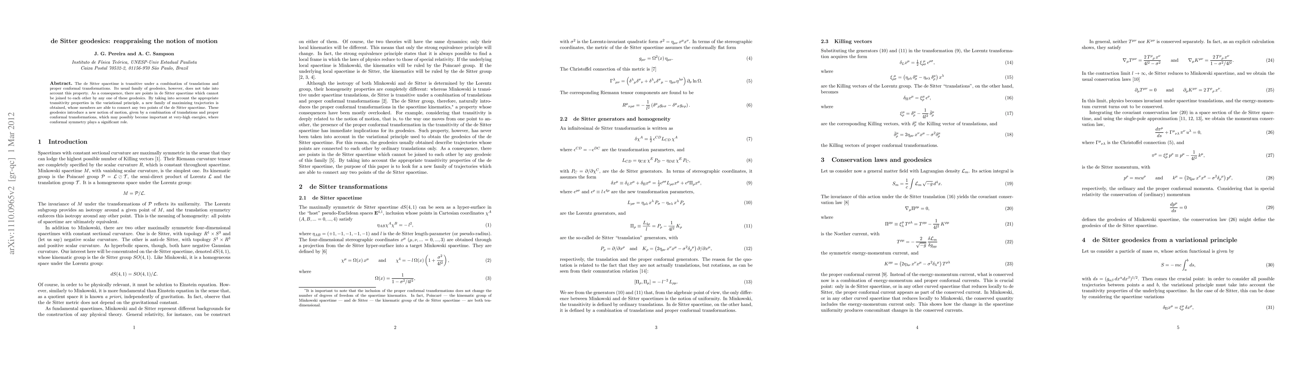 The de Sitter spacetime is transitive under a combination of translations and proper conformal transformations. Its usual family of geodesics, however, does not take into account this property. As a consequence, there are points in de Sitter spacetime which cannot be joined to each other by any one of these geodesics. By taking into account the appropriate transitivity properties in the variational principle, a new family of maximizing trajectories is obtained, whose members are able to connect any two points of the de Sitter spacetime. These geodesics introduce a new notion of motion, given by a combination of translations and proper conformal transformations, which may possibly become important at very-high energies, where conformal symmetry plays a significant role.