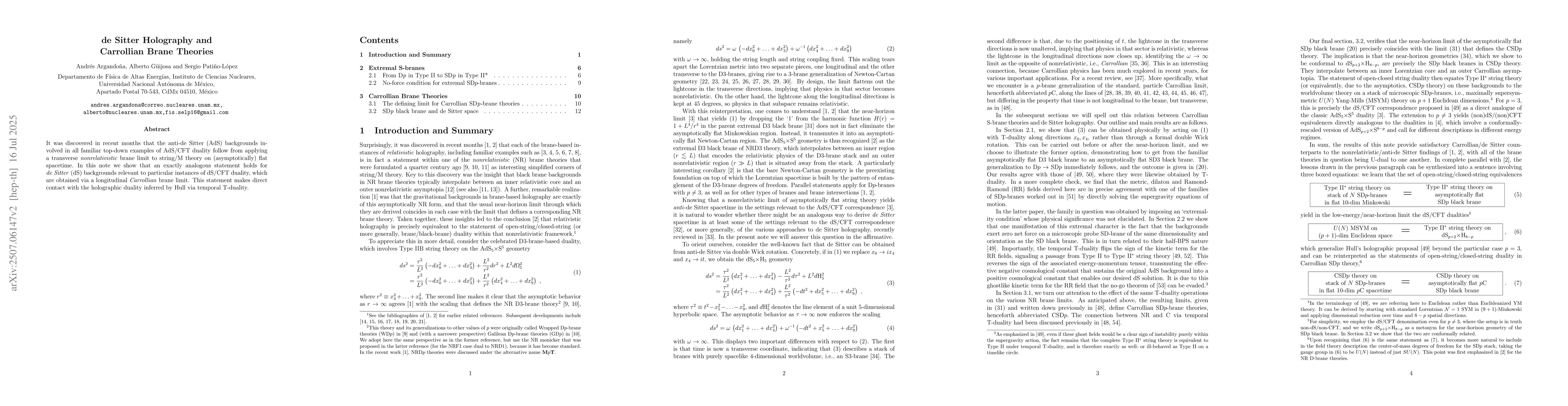 It was discovered in recent months that the anti-de Sitter (AdS) backgrounds involved in all familiar top-down examples of AdS/CFT duality follow from applying a transverse nonrelativistic brane limit to string/M theory on (asymptotically) flat spacetime. In this note we show that an exactly analogous statement holds for de Sitter (dS) backgrounds relevant to particular instances of dS/CFT duality, which are obtained via a longitudinal Carrollian brane limit. This statement makes direct contact with the holographic duality inferred by Hull via temporal T-duality.