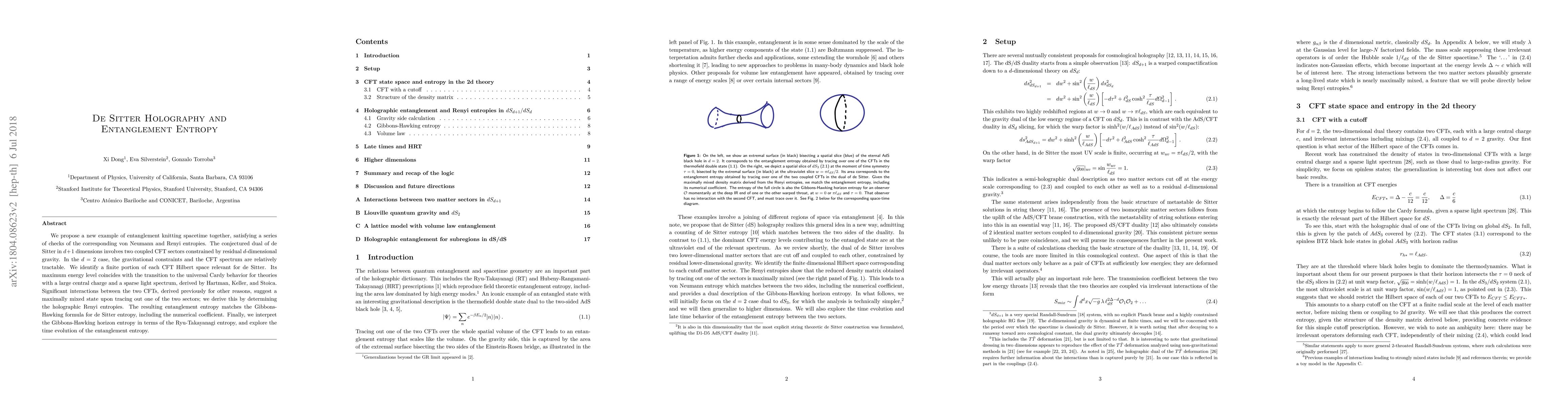 We propose a new example of entanglement knitting spacetime together, satisfying a series of checks of the corresponding von Neumann and Renyi entropies. The conjectured dual of de Sitter in d+1 dimensions involves two coupled CFT sectors constrained by residual d-dimensional gravity. In the d=2 case, the gravitational constraints and the CFT spectrum are relatively tractable. We identify a finite portion of each CFT Hilbert space relevant for de Sitter. Its maximum energy level coincides with the transition to the universal Cardy behavior for theories with a large central charge and a sparse light spectrum, derived by Hartman, Keller, and Stoica. Significant interactions between the two CFTs, derived previously for other reasons, suggest a maximally mixed state upon tracing out one of the two sectors; we derive this by determining the holographic Renyi entropies. The resulting entanglement entropy matches the Gibbons-Hawking formula for de Sitter entropy, including the numerical coefficient. Finally, we interpret the Gibbons-Hawking horizon entropy in terms of the Ryu-Takayanagi entropy, and explore the time evolution of the entanglement entropy.