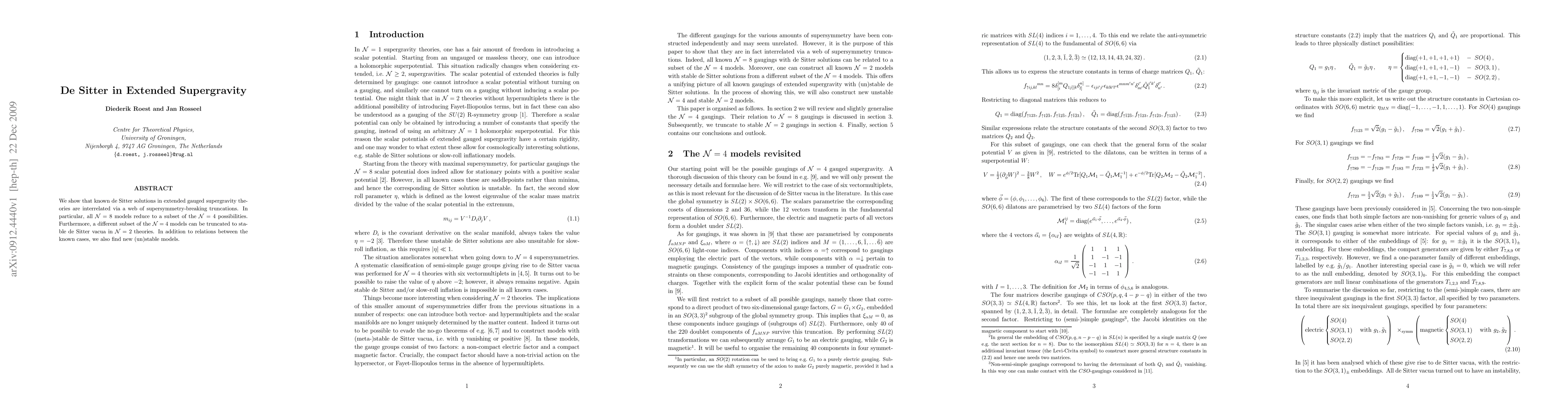The paper presents a detailed analysis of supersymmetry-breaking truncations in extended supergravity theories, revealing interconnections between known de Sitter solutions and identifying new models.