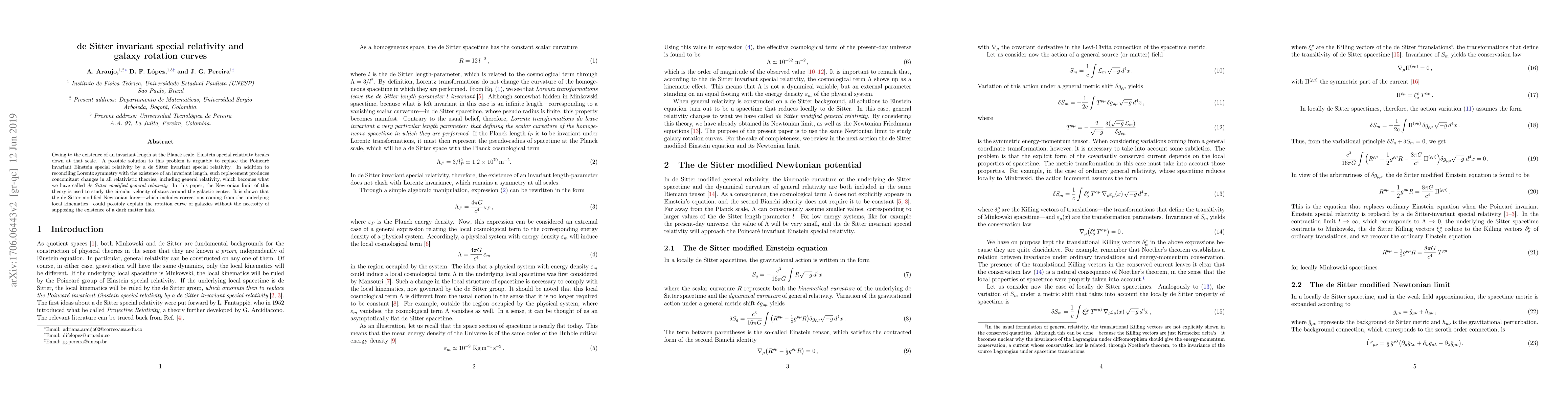 Owing to the existence of an invariant length at the Planck scale, Einstein special relativity breaks down at that scale. A possible solution to this problem is arguably to replace the Poincar\'e invariant Einstein special relativity by a de Sitter invariant special relativity. In addition to reconciling Lorentz symmetry with the existence of an invariant length, such replacement produces concomitant changes in all relativistic theories, including general relativity, which becomes what we have called 'de Sitter modified general relativity'. In this paper, the Newtonian limit of this theory is used to study the circular velocity of stars around the galactic center. It is shown that the de Sitter modified Newtonian force---which includes corrections coming from the underlying local kinematics---could possibly explain the rotation curve of galaxies without the necessity of supposing the existence of a dark matter halo.