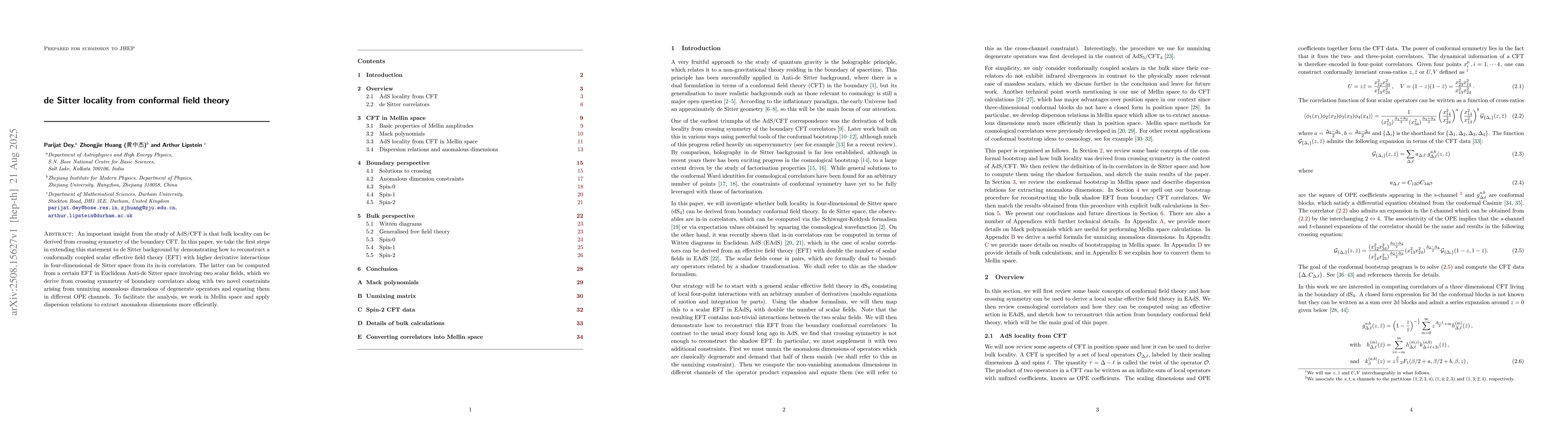 The research employs conformal field theory (CFT) techniques, specifically utilizing Mellin space and dispersion relations, to reconstruct an effective field theory (EFT) in de Sitter space from its boundary CFT correlators. The analysis is facilitated by truncating the sum over spins in conformal block expansions and imposing crossing symmetry, followed by additional constraints on anomalous dimensions to fully reconstruct the shadow action.