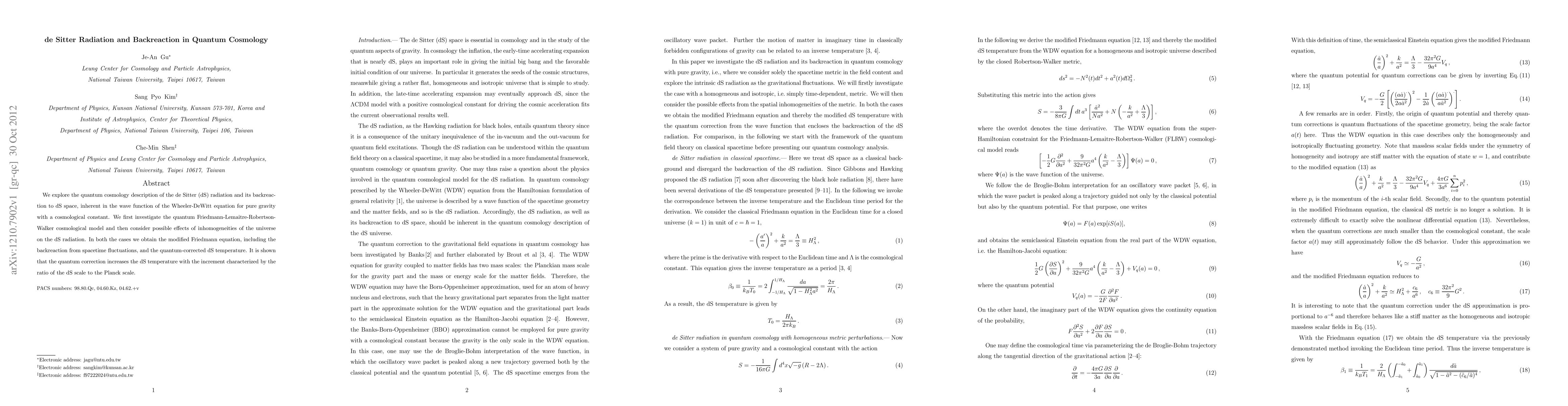 This paper investigates the quantum cosmology of de Sitter (dS) radiation and its backreaction, focusing on the Wheeler-DeWitt equation for pure gravity. It derives a modified Friedmann equation and a quantum-corrected dS temperature, showing that quantum corrections increase the dS temperature proportionally to the ratio of the dS scale to the Planck scale.