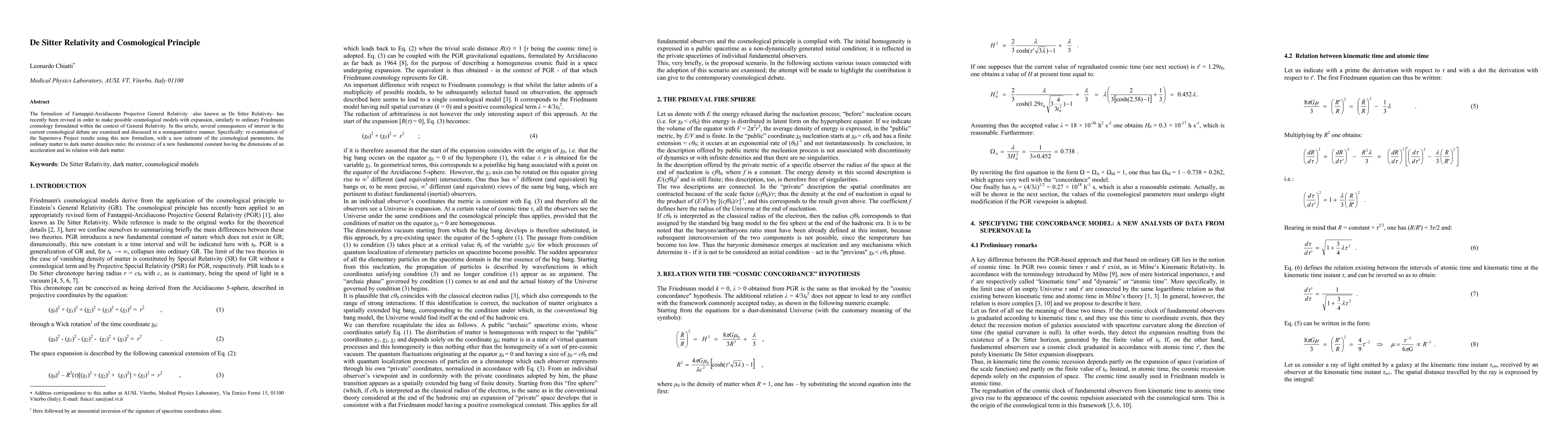 The formalism of Fantappie-Arcidiacono Projective General Relativity - also known as De Sitter Relativity - has recently been revised in order to make possible cosmological models with expansion, similarly to ordinary Fridman cosmology formulated within the context of General Relativity. In this article, several consequences of interest in the current cosmological debate are examined and discussed in a semiquantitative manner. Specifically: re-examination of the Supernova Project results using this new formalism, with a new estimate of the cosmological parameters; the ordinary matter to dark matter densities ratio; the existence of a new fundamental constant having the dimensions of an acceleration and its relation with dark matter.