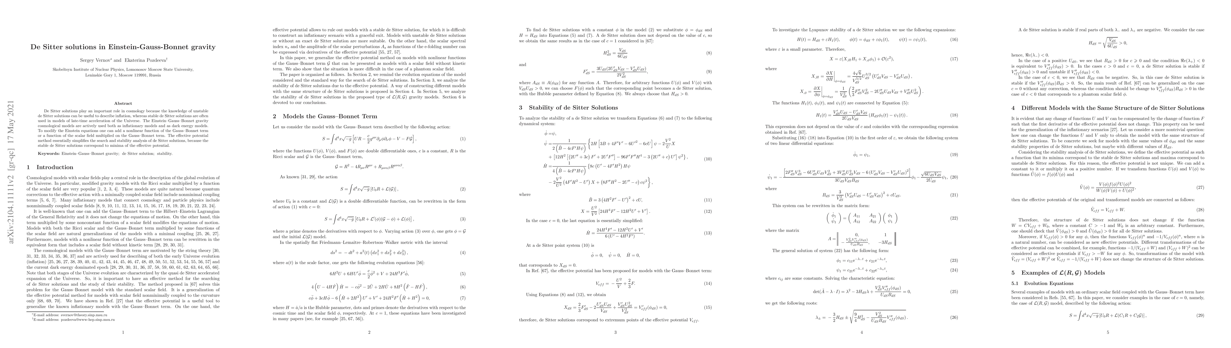 This paper investigates de Sitter solutions within Einstein-Gauss-Bonnet gravity, exploring their roles in inflationary and dark energy models. The effective potential method is employed to simplify the search and stability analysis of these solutions, highlighting their minima's correspondence to stable de Sitter states.