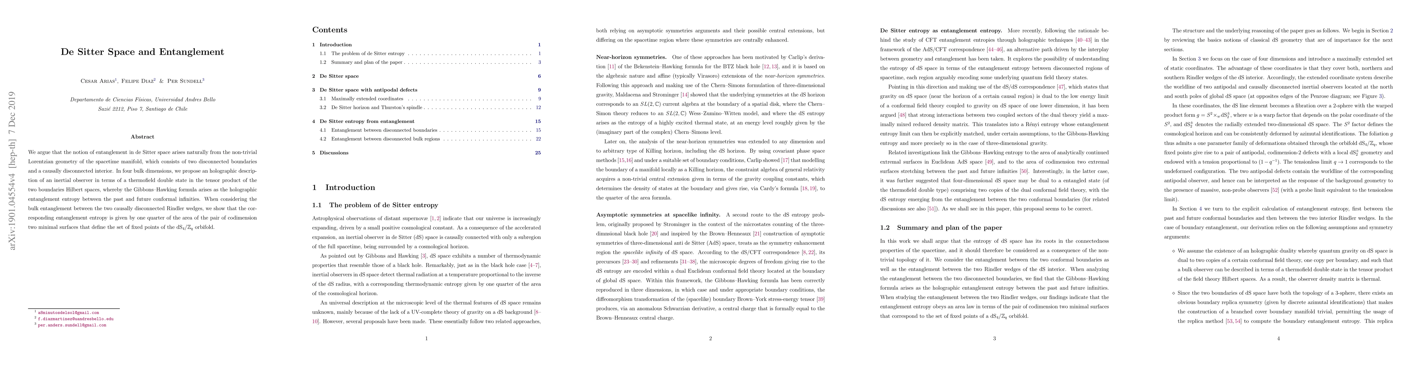 We argue that the notion of entanglement in de Sitter space arises naturally from the non-trivial Lorentzian geometry of the spacetime manifold, which consists of two disconnected boundaries and a causally disconnected interior. In four bulk dimensions, we propose an holographic description of an inertial observer in terms of a thermofield double state in the tensor product of the two boundaries Hilbert spaces, whereby the Gibbons--Hawking formula arises as the holographic entanglement entropy between the past and future conformal infinities. When considering the bulk entanglement between the two causally disconnected Rindler wedges, we show that the corresponding entanglement entropy is given by one quarter of the area of the pair of codimension two minimal surfaces that define the set of fixed points of the dS$_4/\mathbb Z_q$ orbifold.