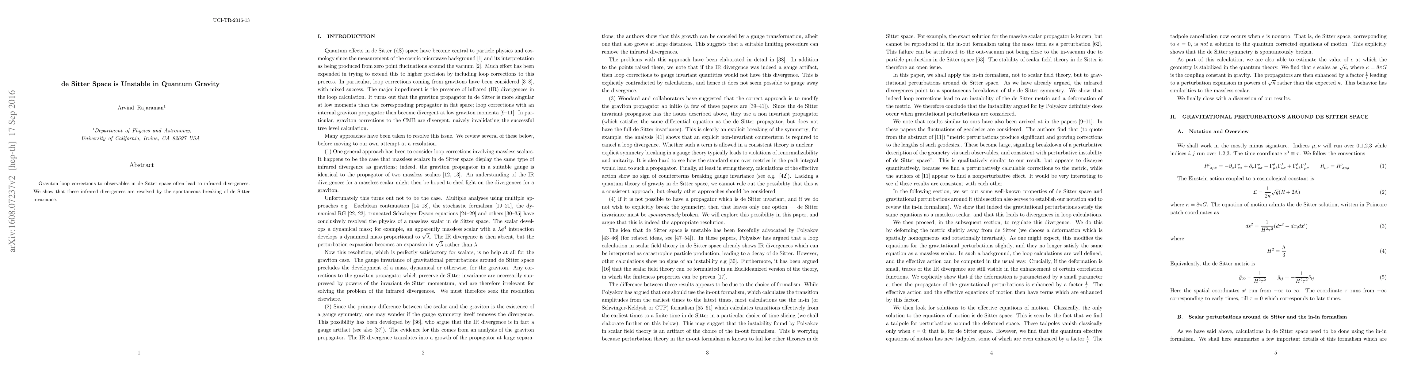 Summary: This paper demonstrates that graviton loop corrections in de Sitter space resolve infrared divergences through the spontaneous breaking of de Sitter invariance, indicating de Sitter space's instability in quantum gravity.