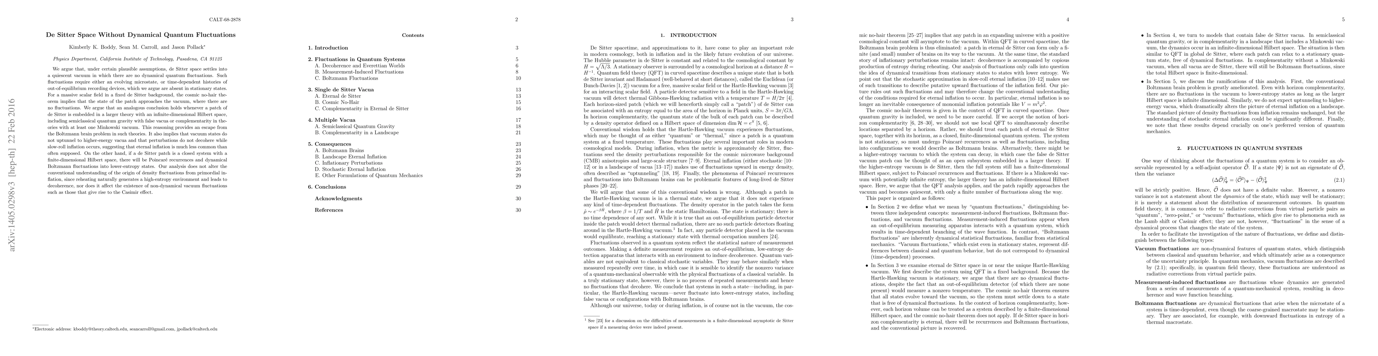 This paper argues that de Sitter space can settle into a quiescent vacuum state without dynamical quantum fluctuations, suggesting that such fluctuations require evolving microstates or time-dependent recording devices, which are absent in stationary states. The reasoning provides a resolution to the Boltzmann brain problem and implies that eternal inflation is less common than typically assumed.