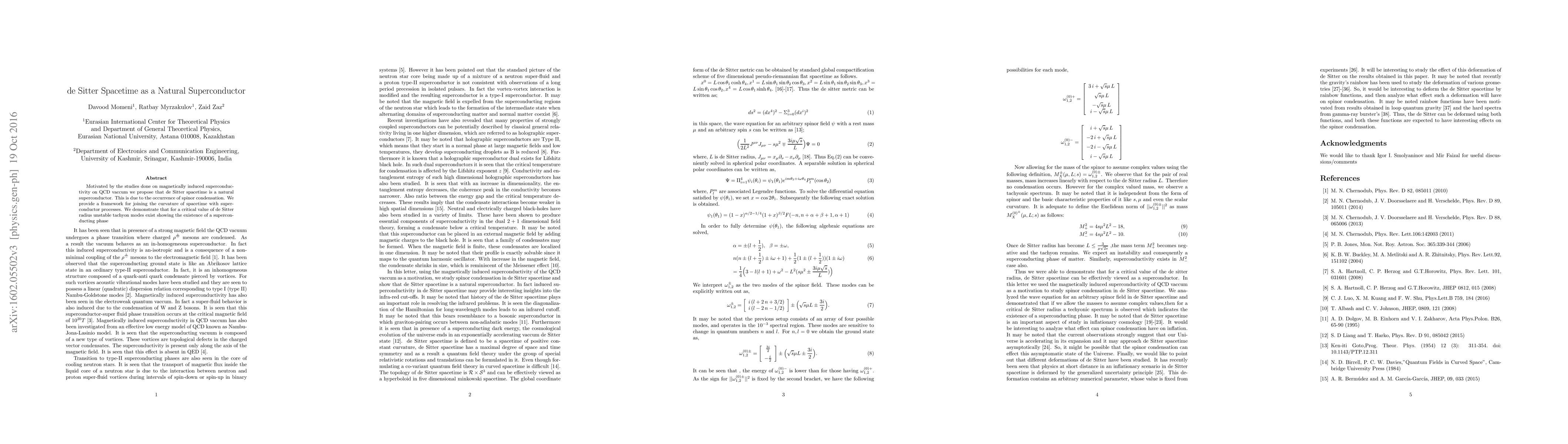 Motivated by the studies done on magnetically induced superconduc- tivity on QCD vaccum we propose that de Sitter spacetime is a natural superconductor. This is due to the occurrence of spinor condensation. We provide a framework for joining the curvature of spacetime with super- conductor processes. We demonstrate that for a critical value of de Sitter radius unstable tachyon modes exist showing the existence of a supercon- ducting phase