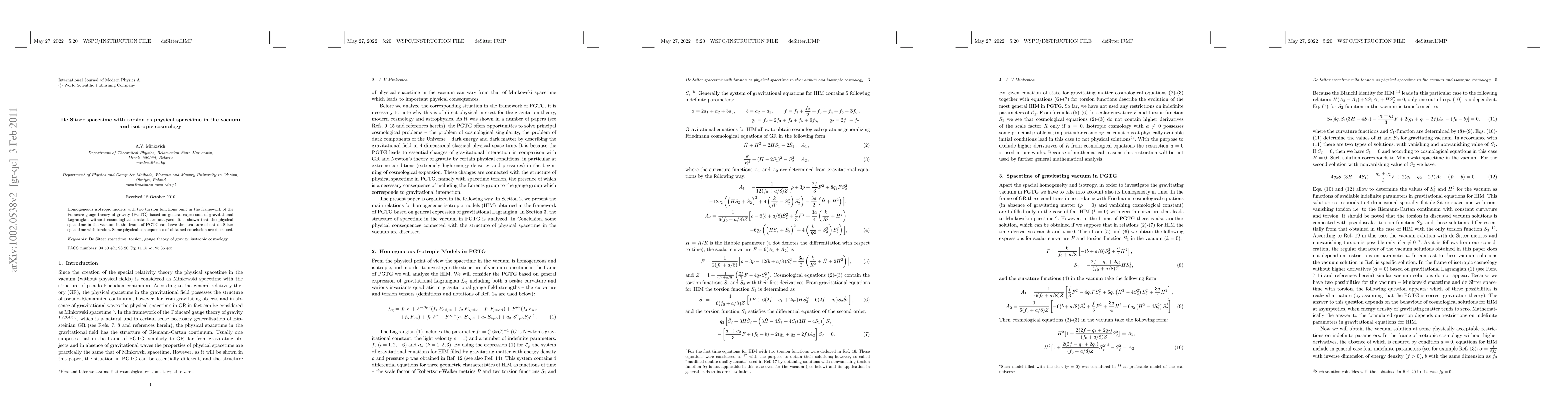 This paper analyzes homogeneous isotropic models in Poincaré gauge theory of gravity (PGTG) and finds that the vacuum physical spacetime can exhibit a flat de Sitter structure with torsion. The study discusses some physical implications of this torsional de Sitter spacetime.