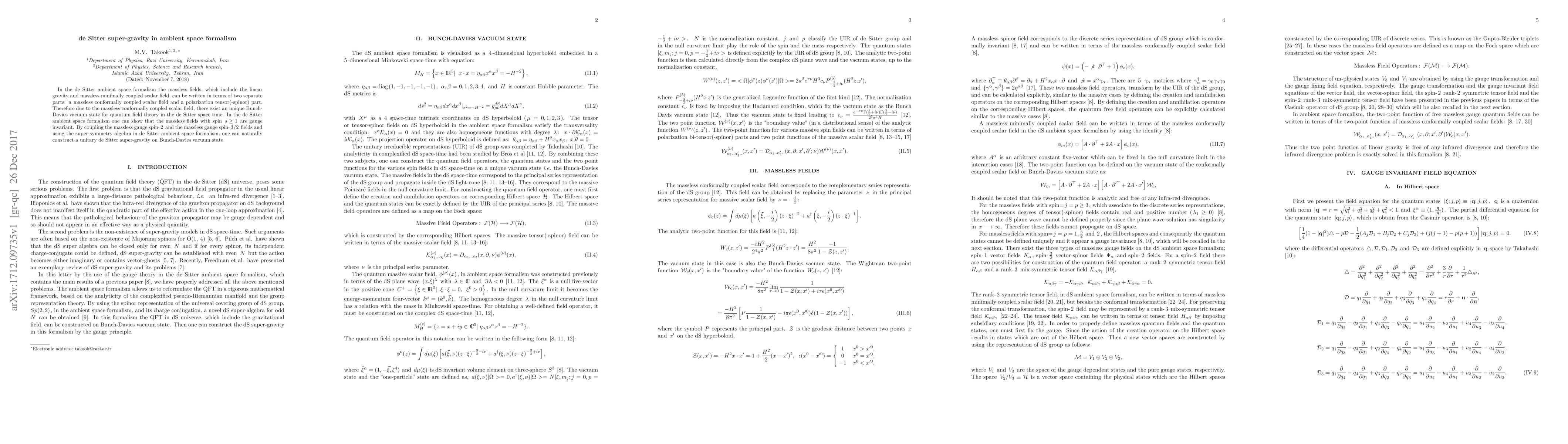 The de Sitter ambient space formalism allows for the separation of massless fields into conformally coupled scalar components and polarization tensor(-spinor) parts, leading to a unique Bunch-Davies vacuum state. It also demonstrates gauge invariance for massless fields with spin $s \geq 1$, and through coupling and super-symmetry, constructs a unitary de Sitter super-gravity on this vacuum state.
