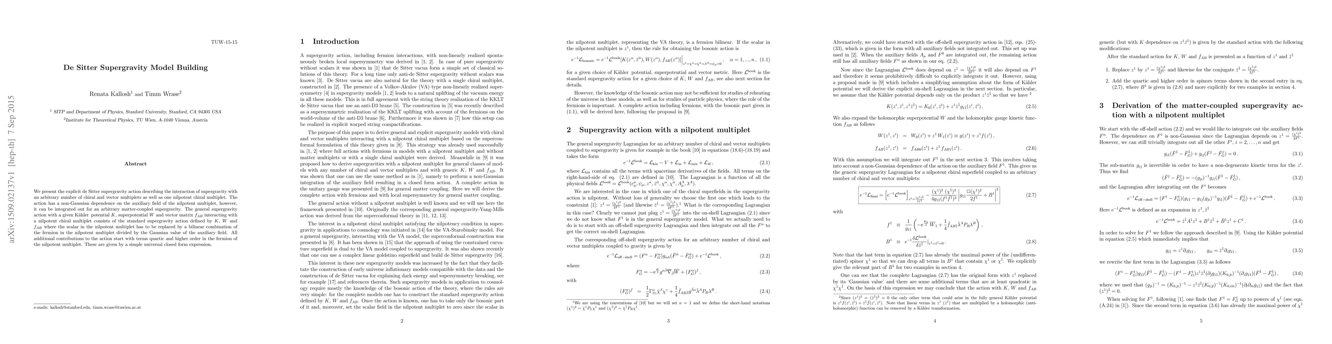 We present the explicit de Sitter supergravity action describing the interaction of supergravity with an arbitrary number of chiral and vector multiplets as well as one nilpotent chiral multiplet. The action has a non-Gaussian dependence on the auxiliary field of the nilpotent multiplet, however, it can be integrated out for an arbitrary matter-coupled supergravity. The general supergravity action with a given Kahler potential $K$, superpotential $W$ and vector matrix $f_{AB}$ interacting with a nilpotent chiral multiplet consists of the standard supergravity action defined by $K$, $W$ and $f_{AB}$ where the scalar in the nilpotent multiplet has to be replaced by a bilinear combination of the fermion in the nilpotent multiplet divided by the Gaussian value of the auxiliary field. All additional contributions to the action start with terms quartic and higher order in the fermion of the nilpotent multiplet. These are given by a simple universal closed form expression.