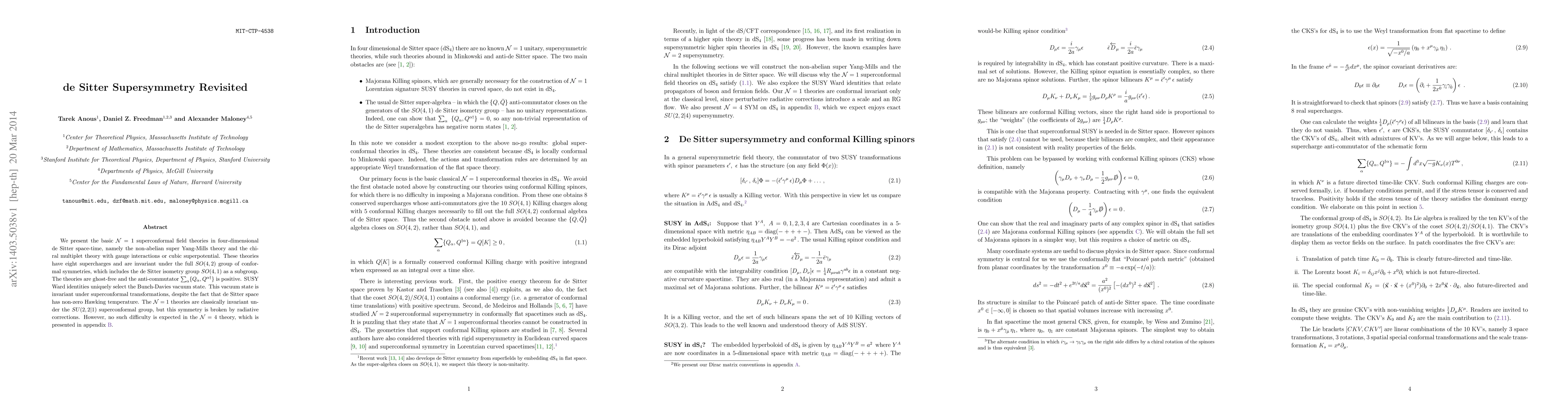 Researchers revisit de Sitter supersymmetry, exploring four-dimensional theories with 8 supercharges that uniquely select the Bunch-Davies vacuum state despite non-zero Hawking temperature.