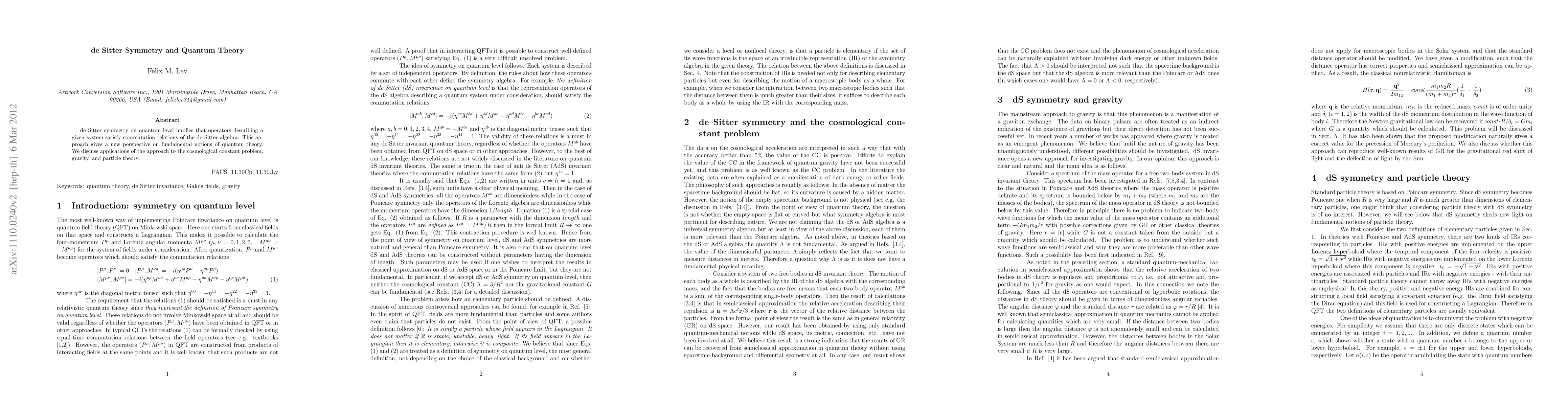 Summary: This paper explores de Sitter symmetry at the quantum level, showing that system operators obey de Sitter algebra commutation relations, offering a fresh view on quantum theory principles. It applies this approach to address the cosmological constant problem, gravity, and particle theory.