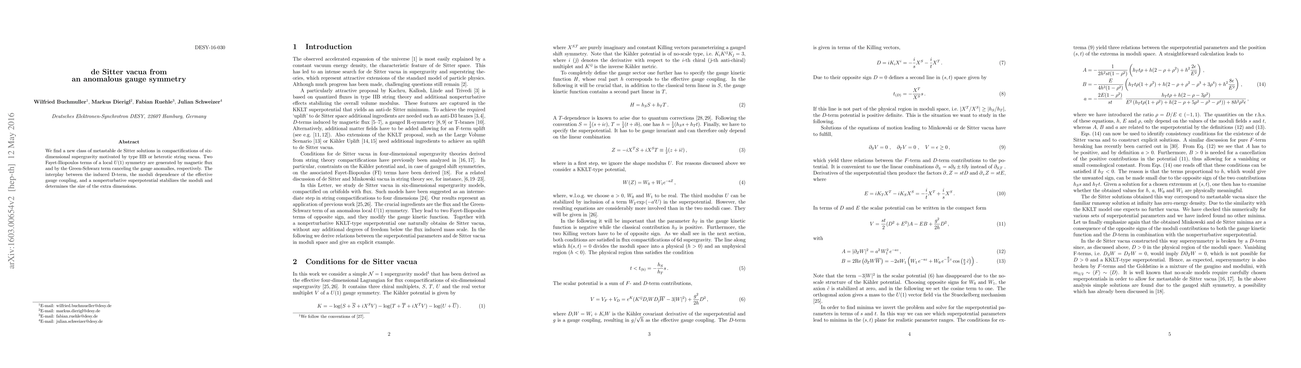 We find a new class of metastable de Sitter solutions in compactifications of six-dimensional supergravity motivated by type IIB or heterotic string vacua. Two Fayet-Iliopoulos terms of a local U(1) symmetry are generated by magnetic flux and by the Green-Schwarz term canceling the gauge anomalies, respectively. The interplay between the induced D-term, the moduli dependence of the effective gauge coupling, and a nonperturbative superpotential stabilizes the moduli and determines the size of the extra dimensions.