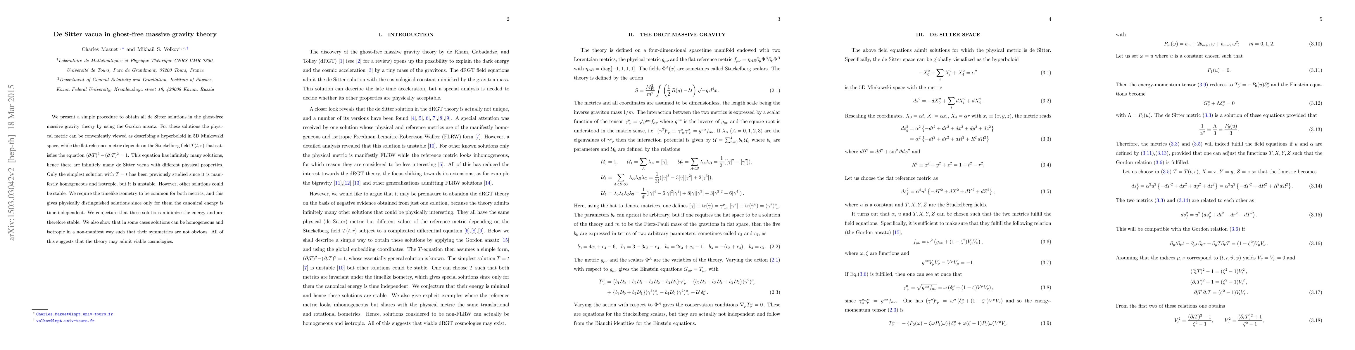This paper presents a method to derive all de Sitter solutions in ghost-free massive gravity using the Gordon ansatz, revealing infinitely many vacua with distinct physical properties. The authors conjecture that solutions with a common timelike isometry may be stable and minimize energy, suggesting the potential viability of these cosmologies.