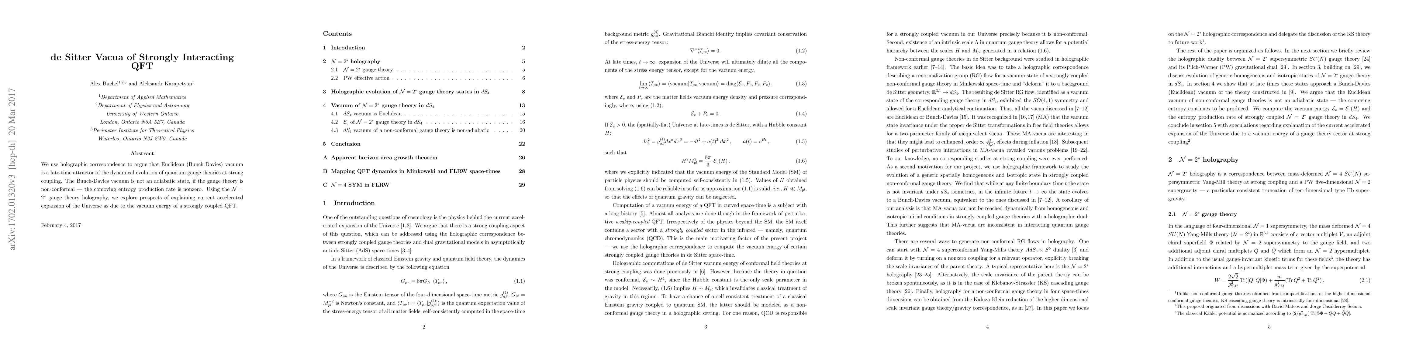 We use holographic correspondence to argue that Euclidean (Bunch-Davies) vacuum is a late-time attractor of the dynamical evolution of quantum gauge theories at strong coupling. The Bunch-Davies vacuum is not an adiabatic state, if the gauge theory is non-conformal --- the comoving entropy production rate is nonzero. Using the N=2* gauge theory holography, we explore prospects of explaining current accelerated expansion of the Universe as due to the vacuum energy of a strongly coupled QFT.