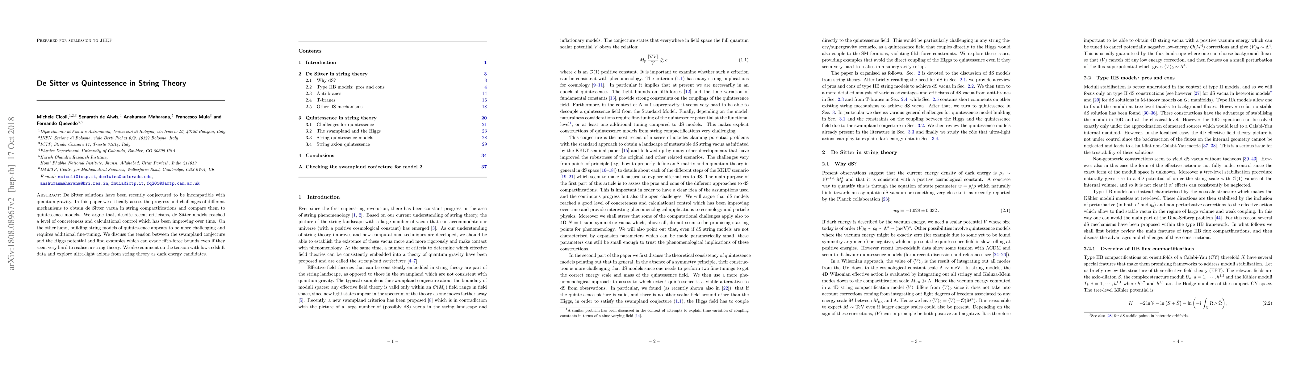This paper evaluates the viability of de Sitter vacua in string theory compared to quintessence models, arguing that while de Sitter models have gained more concreteness, quintessence models face greater challenges and fine-tuning issues. It also discusses the tension between the swampland conjecture and the Higgs potential, and explores ultra-light axions as potential dark energy candidates.