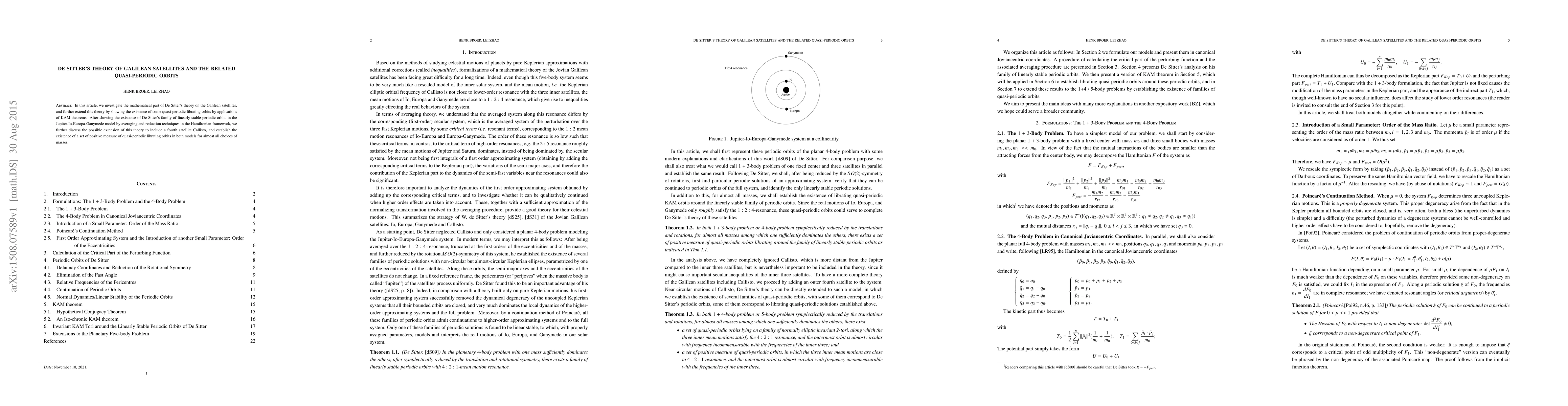 This paper explores De Sitter's theory on Galilean satellites, demonstrating the existence of quasi-periodic orbits using KAM theorems, and extends the theory to include a fourth satellite, Callisto, establishing a set of quasi-periodic orbits with positive measure for most mass configurations.