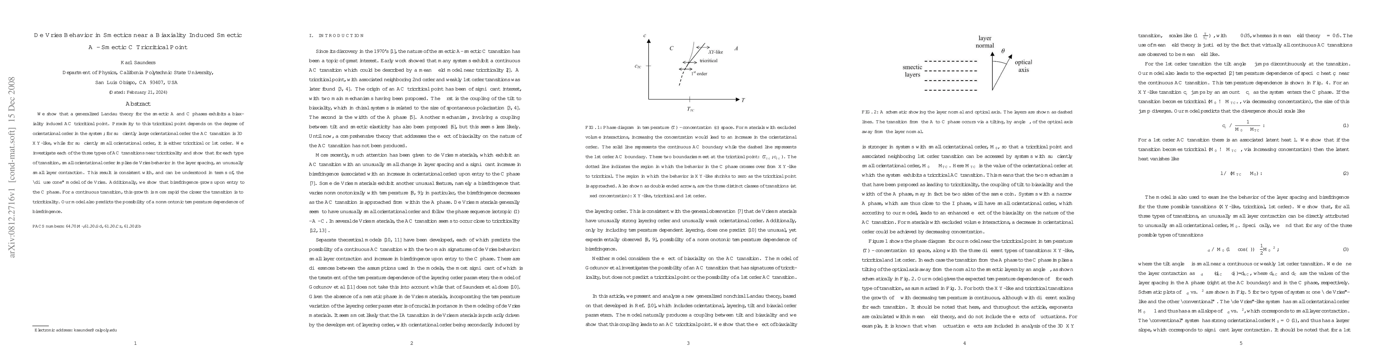 This paper investigates the behavior of smectic liquid crystals near a tricritical point induced by biaxiality, showing that the transition between smectic A and C phases can be 3D XY-like or tricritical/first-order depending on orientational order. It finds de Vries behavior in layer spacing for small orientational order, consistent with the "diffuse cone" model.