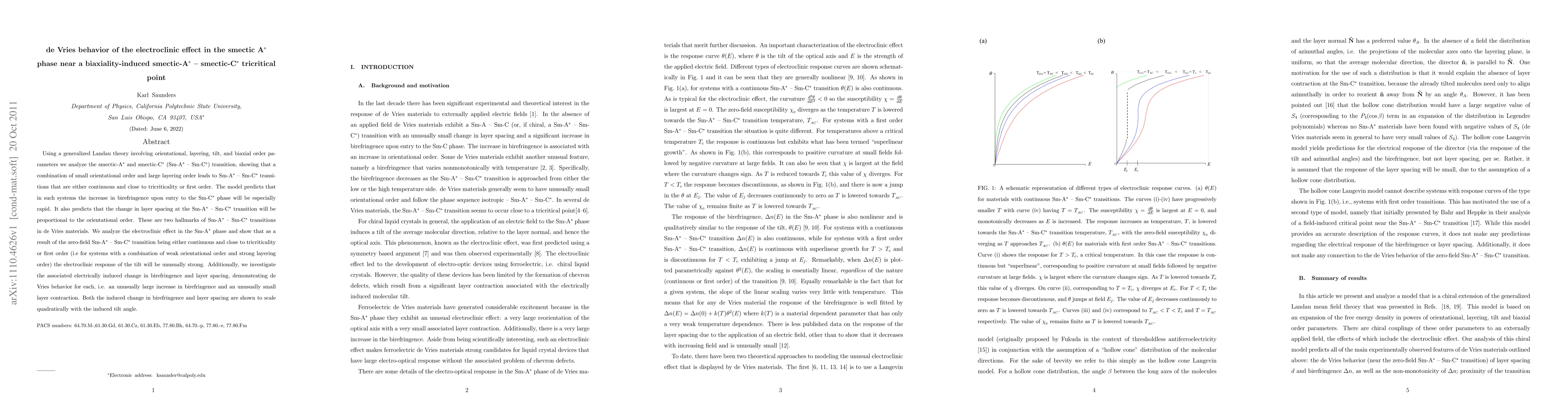 This paper uses a generalized Landau theory to analyze the electroclinic effect in the smectic-A* phase near a tricritical point, showing strong electroclinic response due to a combination of weak orientational and strong layering order. It demonstrates de Vries behavior with unusually large birefringence increase and small layer contraction scaling quadratically with the induced tilt.