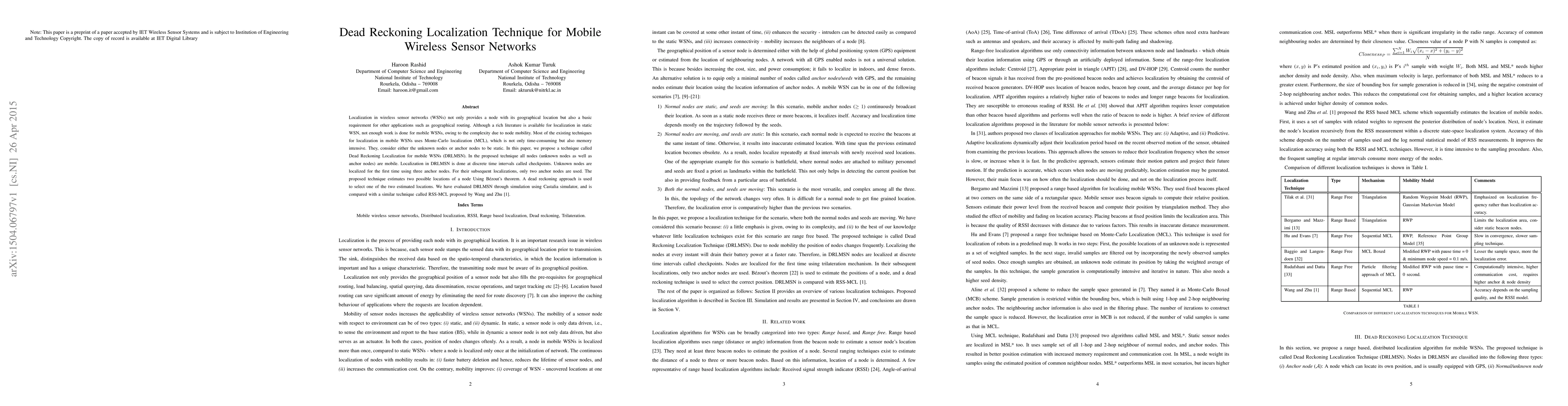 This paper proposes a Dead Reckoning Localization Technique (DRLMSN) for mobile wireless sensor networks, where all nodes are mobile. It localizes nodes using a dead reckoning approach at discrete time intervals, reducing computational load compared to existing Monte-Carlo localization methods. Simulation results show its effectiveness compared to RSS-MCL.