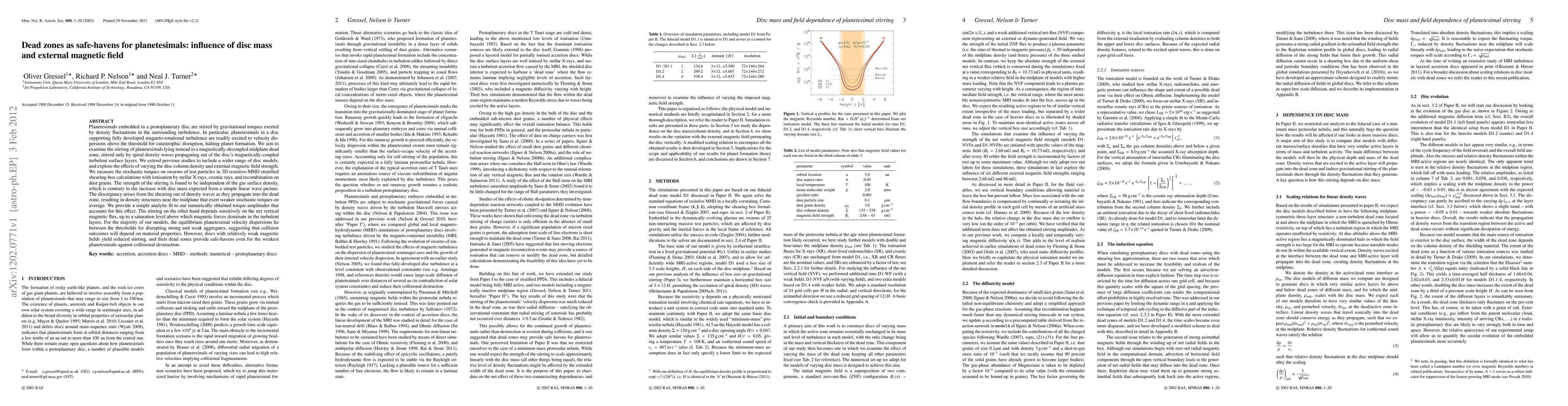This research explores how planetesimals in protoplanetary disc dead zones are stirred by spiral density waves from the turbulent surface layers, finding that stirring is independent of gas surface density but sensitive to the vertical magnetic flux. The dead zones act as safe-havens for planetesimals in discs with weak magnetic fields, protecting them from collisional disruption.