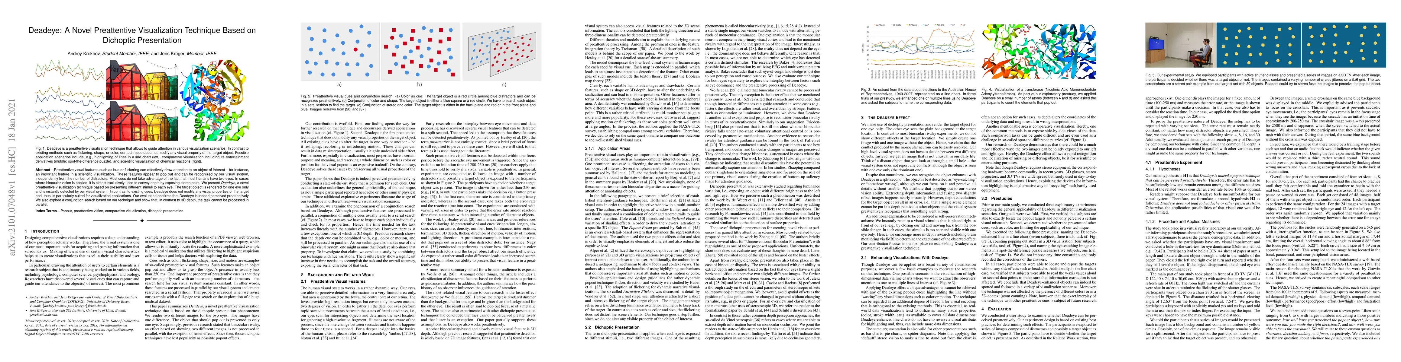 Preattentive visual features such as hue or flickering can effectively draw attention to an object of interest -- for instance, an important feature in a scientific visualization. These features appear to pop out and can be recognized by our visual system, independently from the number of distractors. Most cues do not take advantage of the fact that most humans have two eyes. In cases where binocular vision is applied, it is almost exclusively used to convey depth by exposing stereo pairs. We present Deadeye, a novel preattentive visualization technique based on presenting different stimuli to each eye. The target object is rendered for one eye only and is instantly detected by our visual system. In contrast to existing cues, Deadeye does not modify any visual properties of the target and, thus, is particularly suited for visualization applications. Our evaluation confirms that Deadeye is indeed perceived preattentively. We also explore a conjunction search based on our technique and show that, in contrast to 3D depth, the task cannot be processed in parallel.
