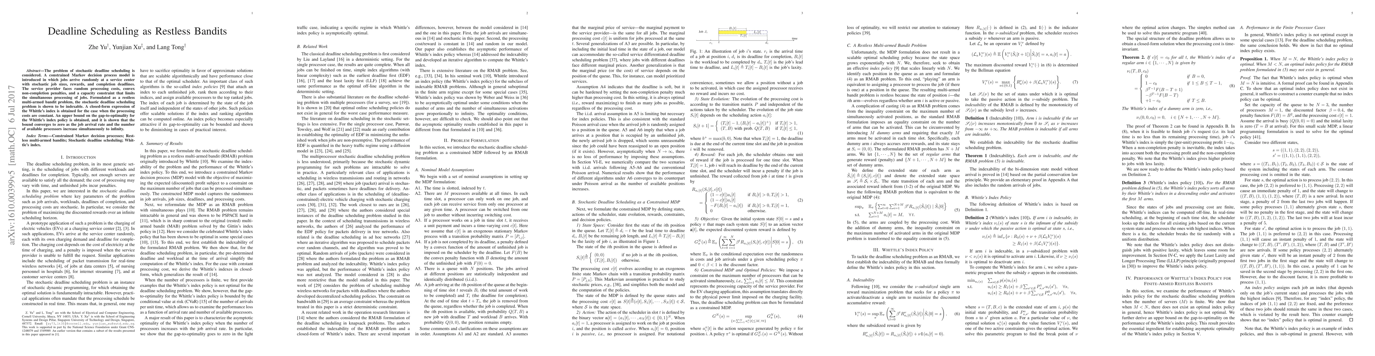 This paper addresses stochastic deadline scheduling as a restless multi-armed bandit problem, introducing a constrained Markov decision process model. The Whittle's index policy is shown to be optimal, with a closed-form expression derived for constant processing costs, and an upper bound on the optimality gap that converges to zero under certain conditions.