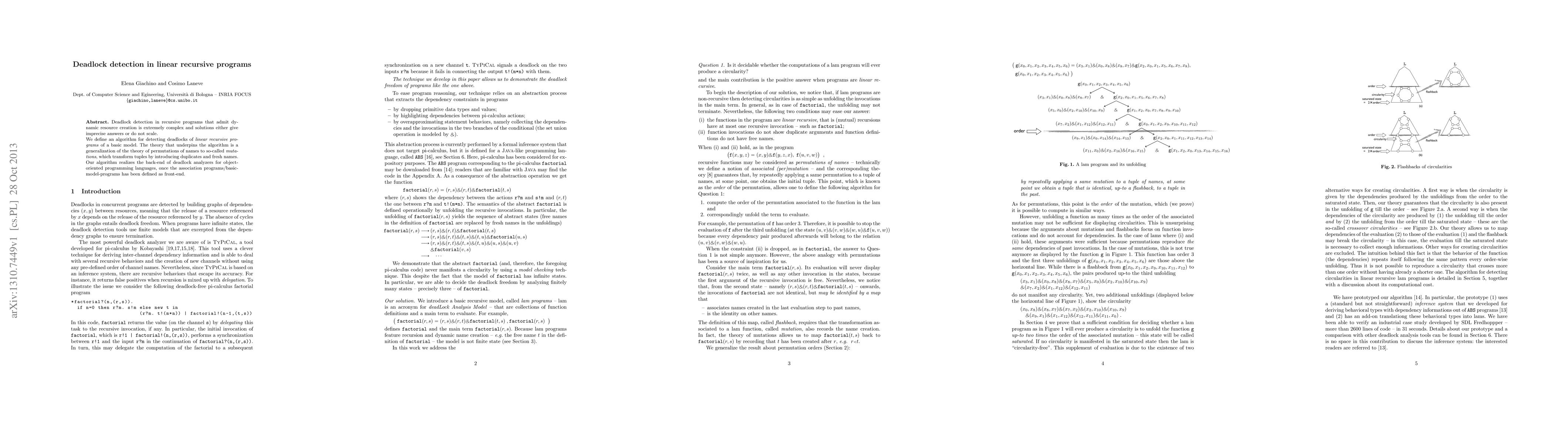 Deadlock detection in recursive programs that admit dynamic resource creation is extremely complex and solutions either give imprecise answers or do not scale. We define an algorithm for detecting deadlocks of "linear recursive programs" of a basic model. The theory that underpins the algorithm is a generalization of the theory of permutations of names to so-called "mutations", which transform tuples by introducing duplicates and fresh names. Our algorithm realizes the back-end of deadlock analyzers for object-oriented programming languages, once the association programs/basic-model-programs has been defined as front-end.