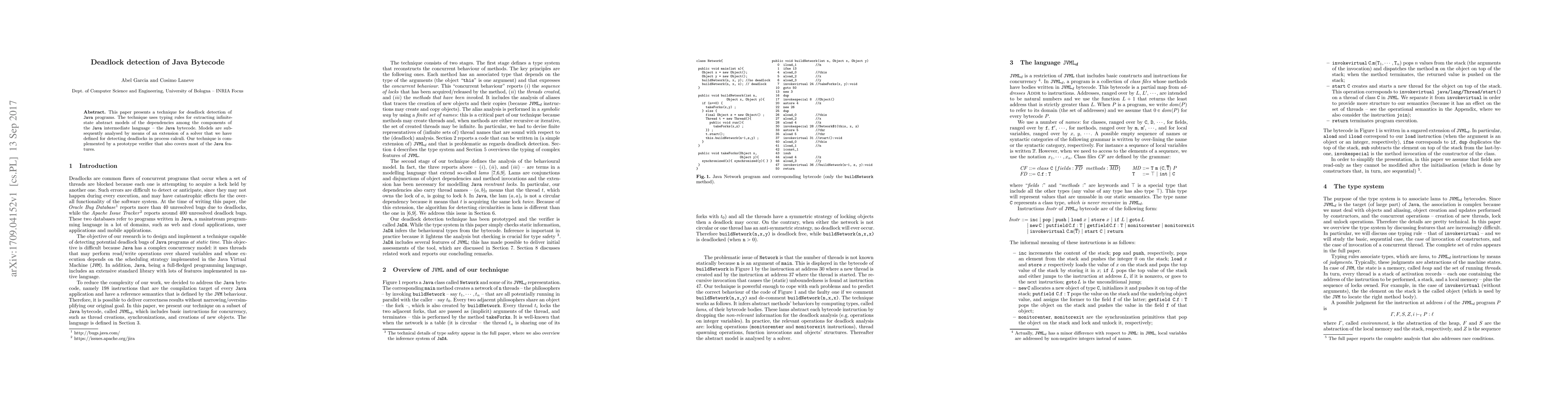 This paper introduces a method for detecting deadlocks in Java programs by creating infinite-state abstract models from Java bytecode dependencies, analyzed using a specialized solver, and demonstrates a prototype verifier that supports most Java features.