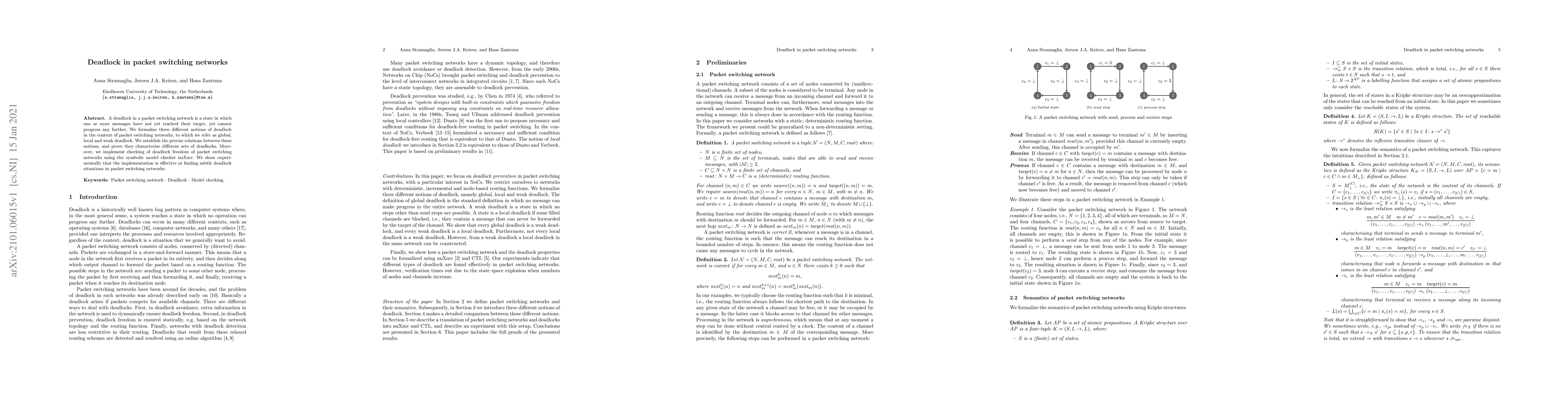 This paper formalizes three types of deadlock in packet switching networks—global, local, and weak—and establishes their relationships. It also demonstrates an effective symbolic model checking method using nuXmv to detect these deadlocks, showing its practical effectiveness in identifying complex deadlock scenarios.