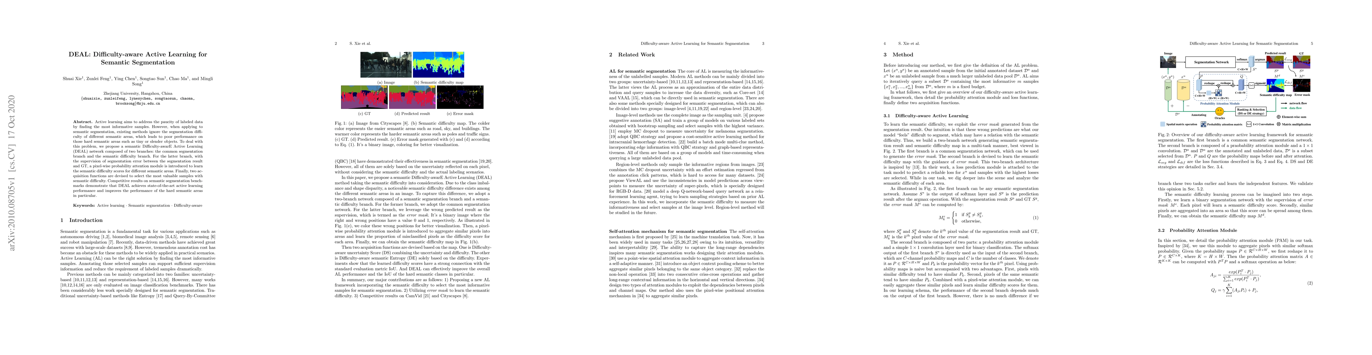 The paper proposes DEAL, a Difficulty-aware Active Learning network for semantic segmentation that addresses the issue of poor performance on difficult areas like tiny or slender objects. It uses a dual-branch architecture with a pixel-wise attention module to learn semantic difficulty scores, and two acquisition functions to select the most informative samples, achieving state-of-the-art results.