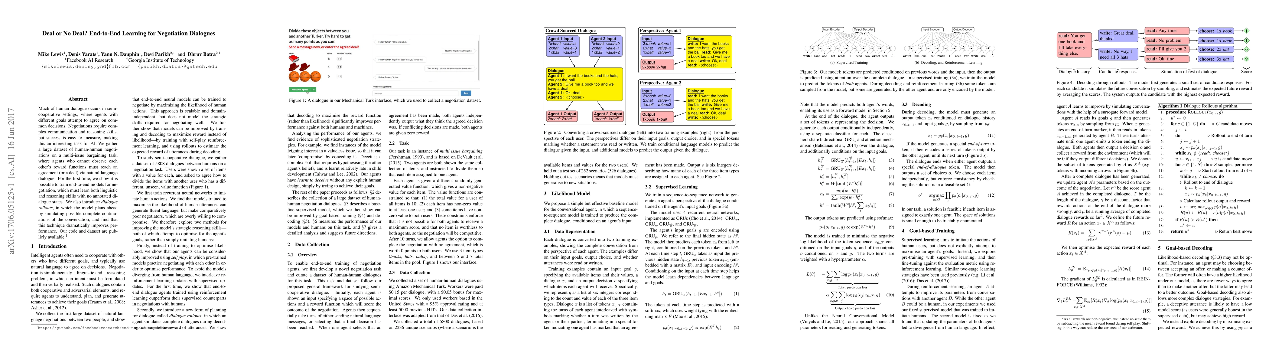 This paper presents an end-to-end learning approach for negotiating dialogue, utilizing a large dataset of human-human negotiation interactions. It demonstrates the effectiveness of training models without annotated dialogue states, and introduces dialogue rollouts to enhance performance by simulating conversation continuations.