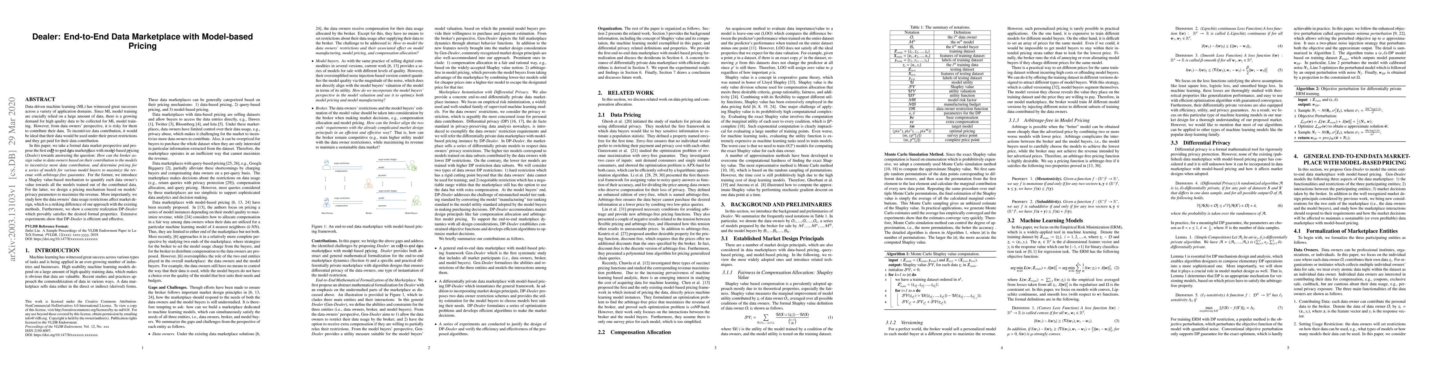 The Dealer paper proposes a data marketplace with model-based pricing to incentivize data contribution from data owners while respecting their restrictions. It introduces a Shapley value-based mechanism to quantify each owner's value and a pricing mechanism based on models' privacy parameters to maximize revenue.