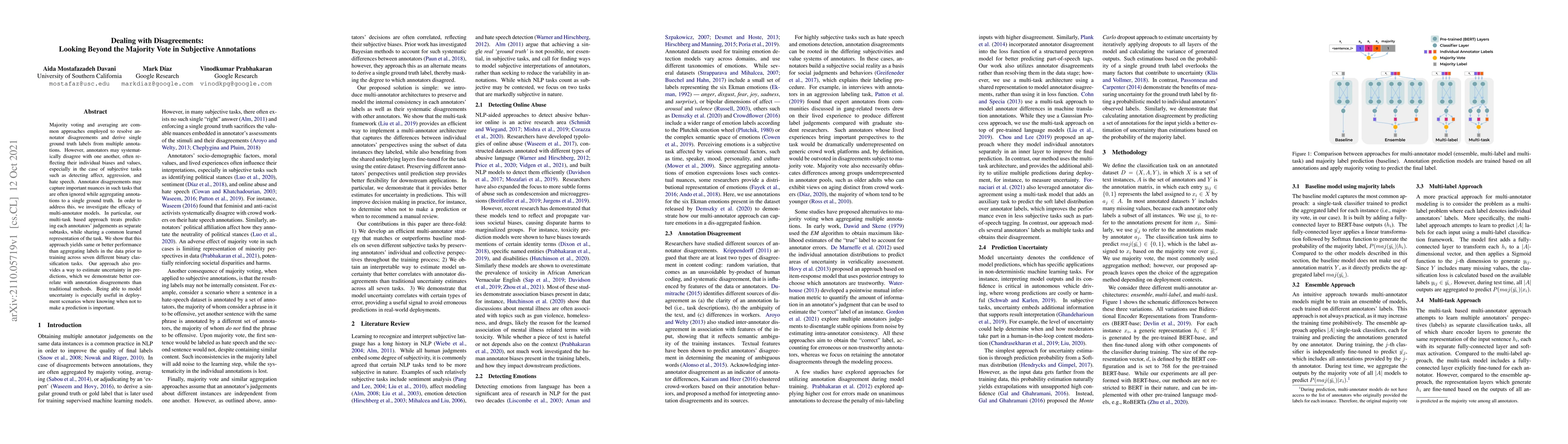 Majority voting and averaging are common approaches employed to resolve annotator disagreements and derive single ground truth labels from multiple annotations. However, annotators may systematically disagree with one another, often reflecting their individual biases and values, especially in the case of subjective tasks such as detecting affect, aggression, and hate speech. Annotator disagreements may capture important nuances in such tasks that are often ignored while aggregating annotations to a single ground truth. In order to address this, we investigate the efficacy of multi-annotator models. In particular, our multi-task based approach treats predicting each annotators' judgements as separate subtasks, while sharing a common learned representation of the task. We show that this approach yields same or better performance than aggregating labels in the data prior to training across seven different binary classification tasks. Our approach also provides a way to estimate uncertainty in predictions, which we demonstrate better correlate with annotation disagreements than traditional methods. Being able to model uncertainty is especially useful in deployment scenarios where knowing when not to make a prediction is important.