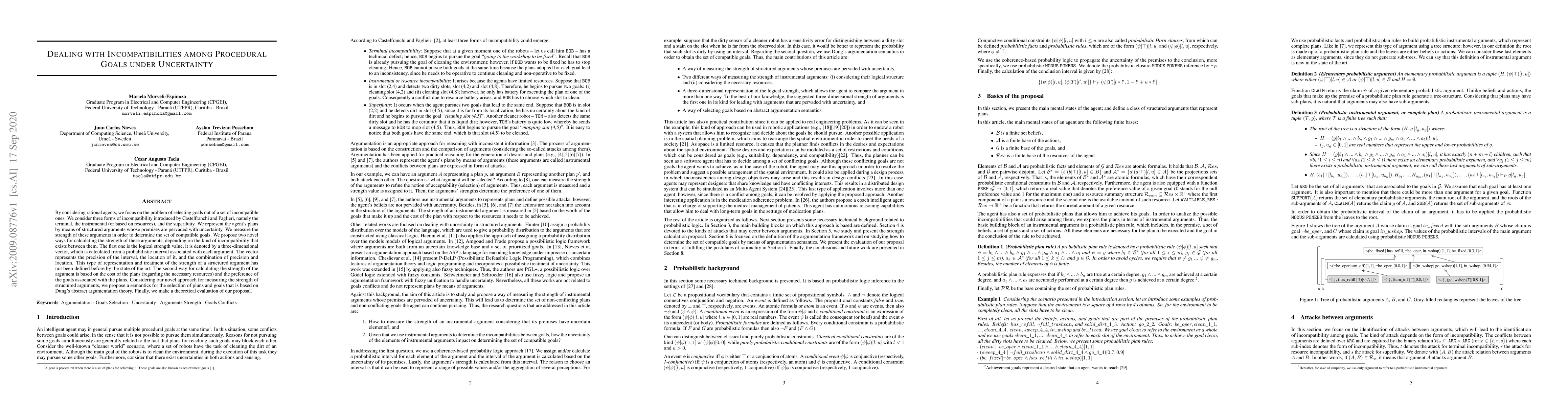 This paper proposes a novel method for selecting goals among a set of incompatible ones for rational agents, introducing a new way to represent and calculate the strength of structured arguments under uncertainty. The authors propose two approaches to determine goal compatibility, using probabilistic intervals and resource costs, and apply Dung's abstract argumentation theory for plan selection.