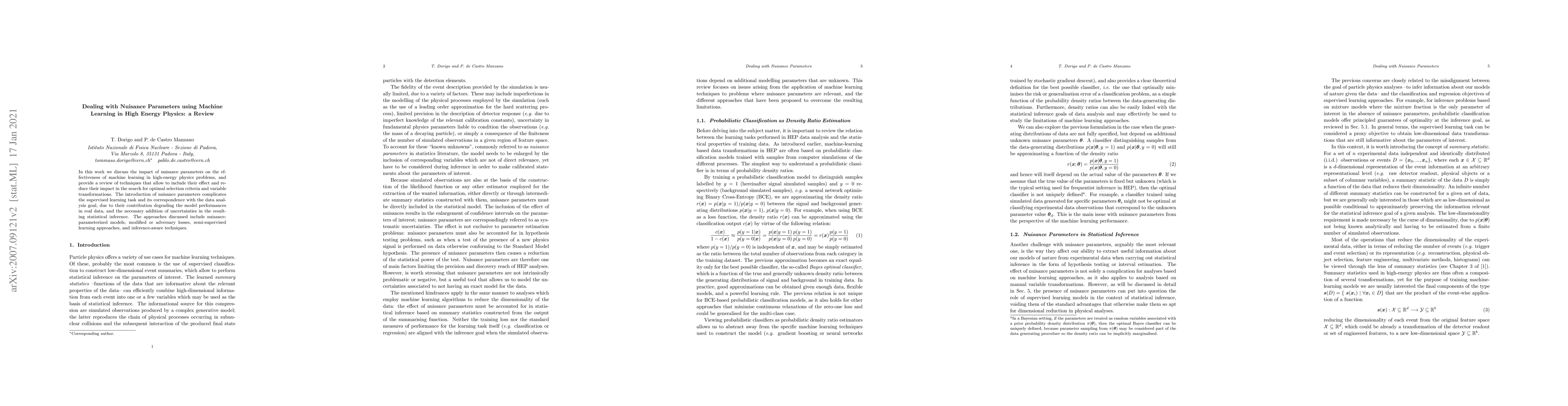 In this work we discuss the impact of nuisance parameters on the effectiveness of machine learning in high-energy physics problems, and provide a review of techniques that allow to include their effect and reduce their impact in the search for optimal selection criteria and variable transformations. The introduction of nuisance parameters complicates the supervised learning task and its correspondence with the data analysis goal, due to their contribution degrading the model performances in real data, and the necessary addition of uncertainties in the resulting statistical inference. The approaches discussed include nuisance-parameterized models, modified or adversary losses, semi-supervised learning approaches, and inference-aware techniques.